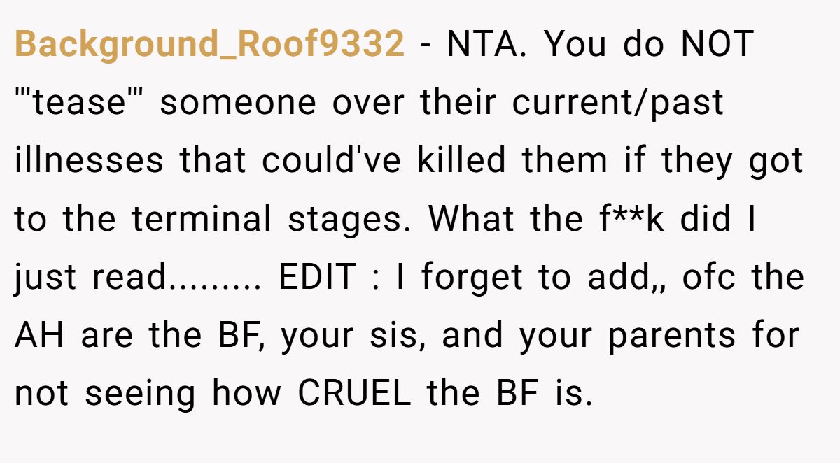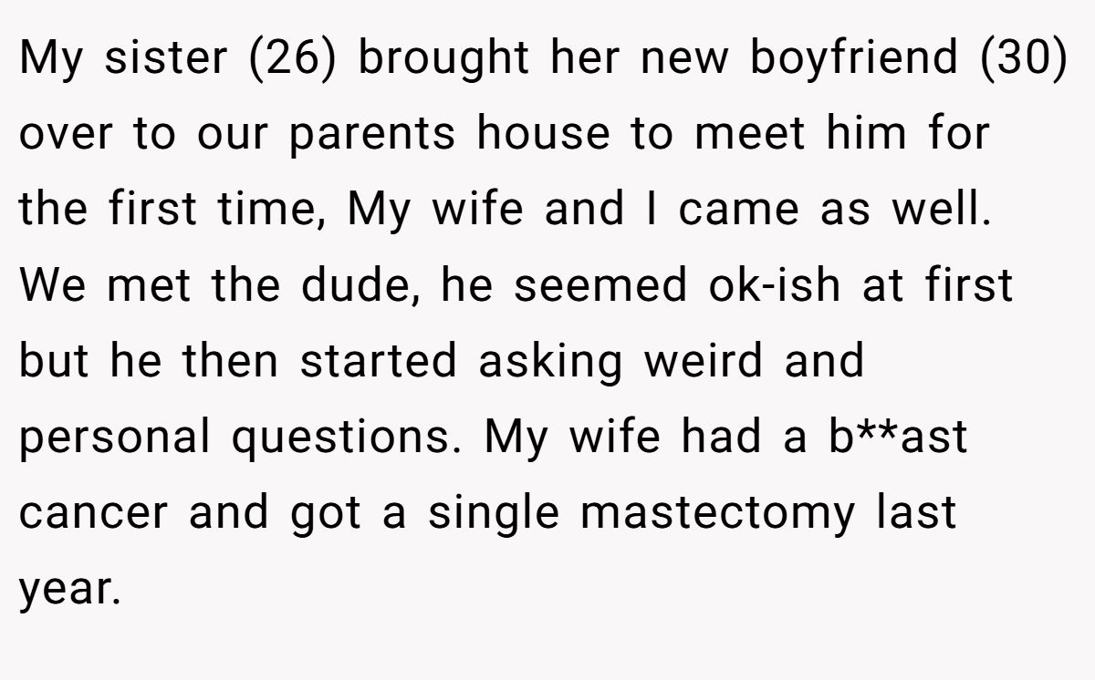 This Redditor’s fierce defense of his wife after a cruel mastectomy “joke” sent his sister’s boyfriend fleeing and ignited a family firestorm. His sister’s “princess” jab and parents’ peace plea only fueled the tension.
