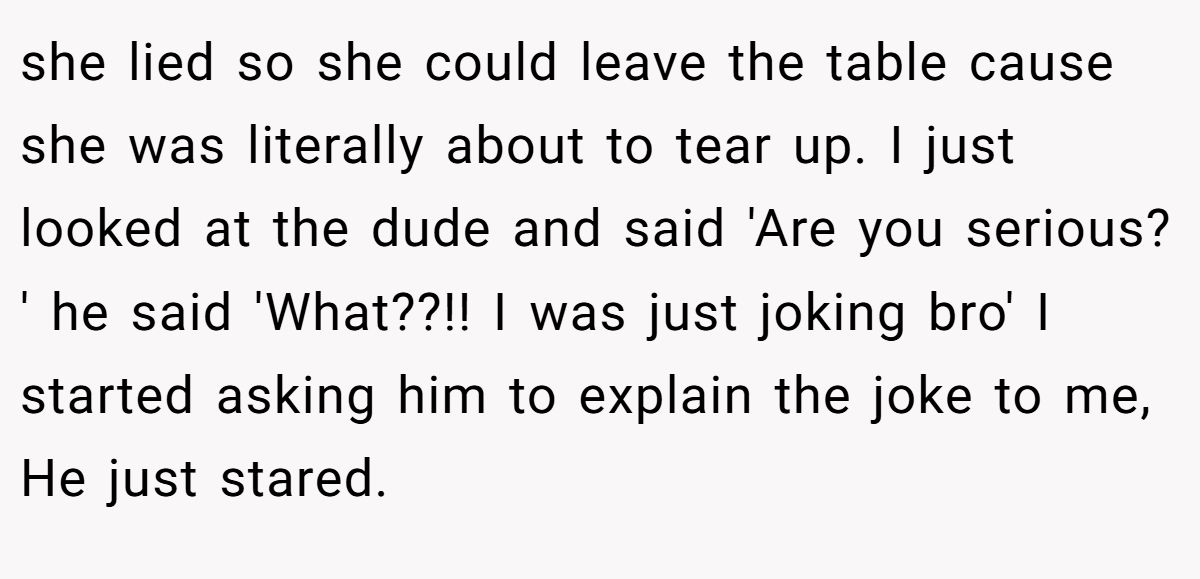 One Reddit user’s family dinner turned from awkward to appalling when his sister brought a new boyfriend who thought “teasing” his wife about her cancer battle was somehow acceptable conversation. The boyfriend’s idea of a joke? A comment about her mastectomy. The husband’s response? Calm. Cold. And completely perfect.
