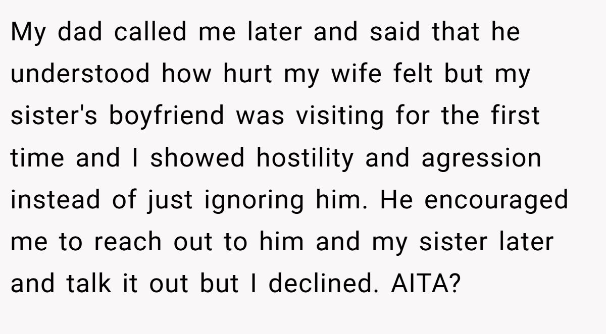 Could this have been less explosive? A calmer request for an apology might’ve kept the dinner civil, but the boyfriend’s refusal to own his mistake justified the Redditor’s persistence. Neutral advice? Stand by your wife, but consider a private talk with your sister to address her blind spot. The boyfriend owes a sincere apology. What do you think—heroic stand or dinner disaster?