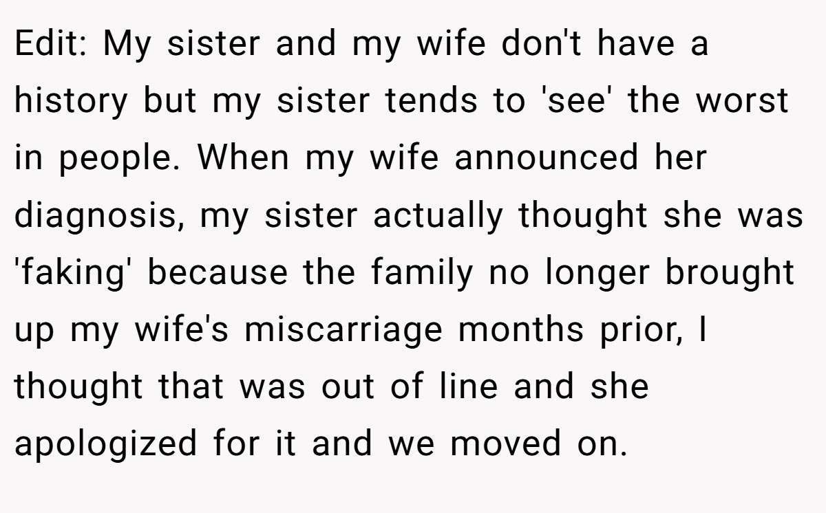 Family dynamics can amplify hurt. A 2022 study by the American Psychological Association found that 35% of family conflicts arise from insensitive remarks, often worsened by defensiveness. The sister’s dismissal of her boyfriend’s cruelty and her “princess” jab at the wife show a troubling pattern, especially given her past doubts about the wife’s diagnosis. The parents’ call for peace sidesteps the boyfriend’s accountability.