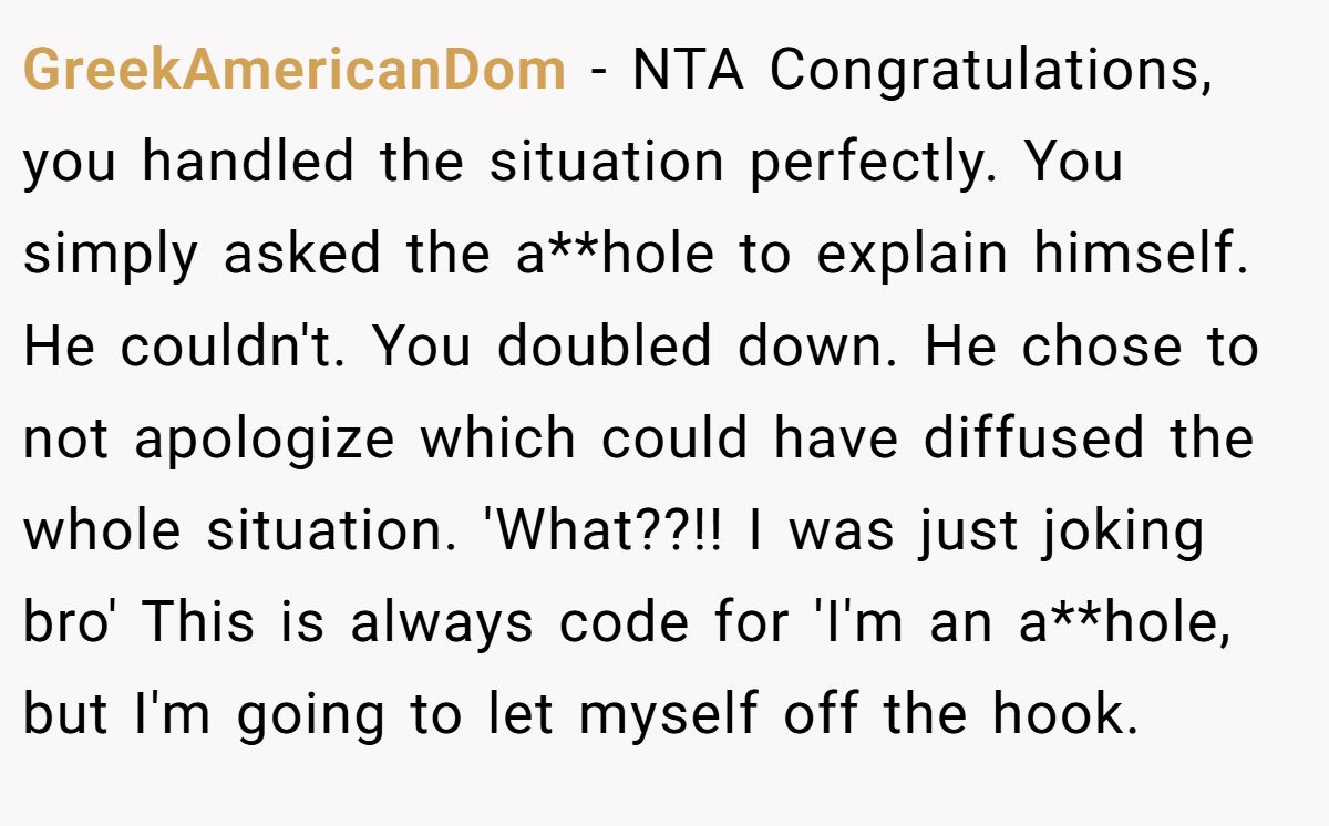 GreekAmericanDom praised the Redditor’s restraint, noting the boyfriend’s refusal to apologize showed his true colors.