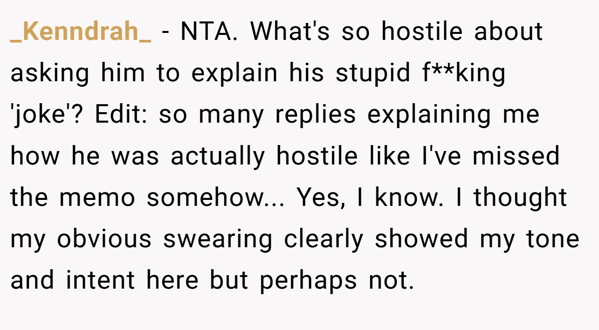 Kenndrah backed the Redditor’s demand for an explanation, mocking the boyfriend’s “joke” as indefensible.