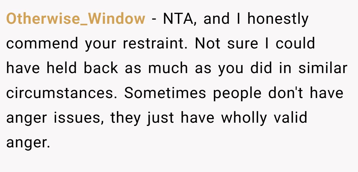 Otherwise_Window commended the Redditor’s calm, saying his anger was wholly valid.