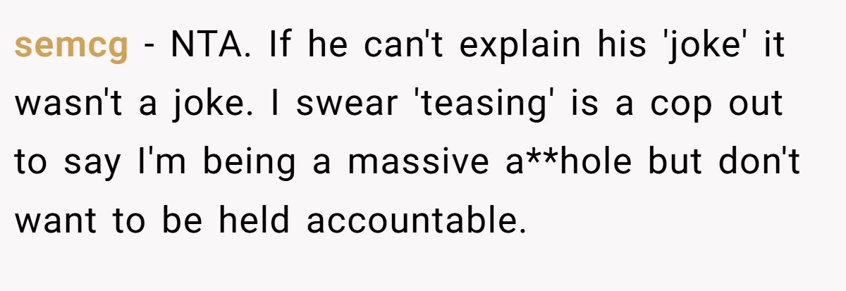 Semcg called the boyfriend’s “teasing” a cop-out for being cruel, supporting the Redditor.