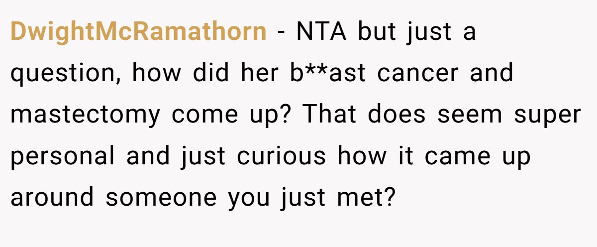 Respecting medical trauma is non-negotiable. Dr. Susan Love, a br**st cancer expert, noted in a 2023 Healthline article, “Insensitive comments about cancer can reopen emotional wounds for survivors”. The boyfriend’s “playful” remark about the Redditor’s wife’s mastectomy was not just tasteless but deeply hurtful, especially given her recent battle. The Redditor’s demand for an explanation was less about aggression and more about holding the boyfriend accountable for his callousness.