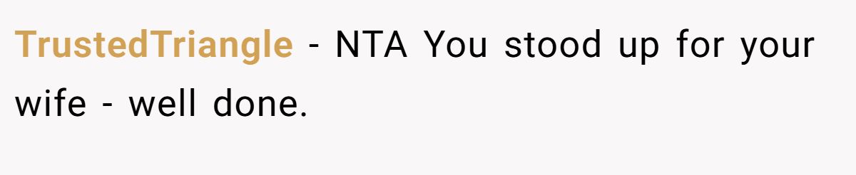 TrustedTriangle cheered the Redditor for standing up for his wife’s dignity.