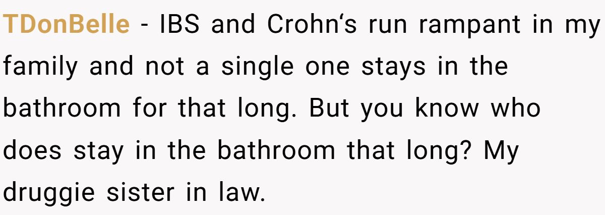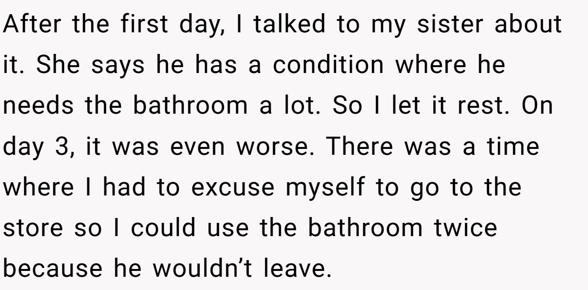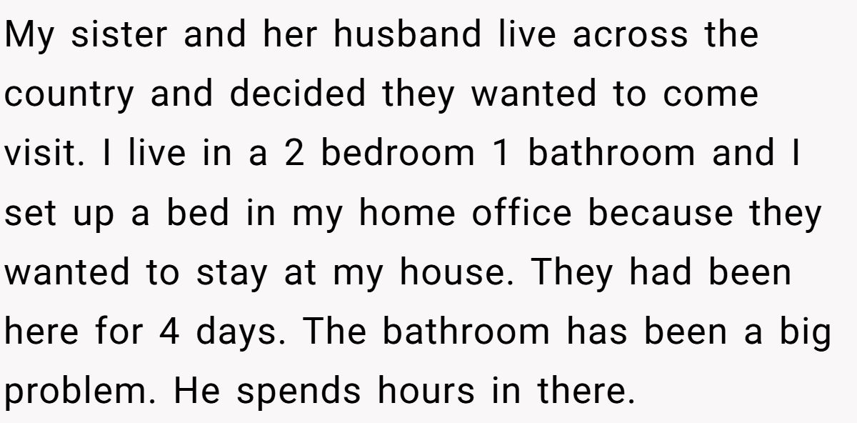 Bathroom space may seem trivial—until it’s not. For one Redditor, sharing her home with her sister and brother-in-law turned into a logistical and emotional nightmare. With only one bathroom, a guest hogging the space for literal hours at a time was more than inconvenient—it was humiliating.