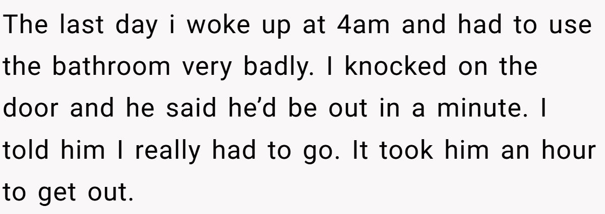 Imagine waking up at 4AM, urgently needing the bathroom—only to find your house guest already locked in for the next hour. That’s exactly what happened to one Redditor, and the outcome was, quite literally, messy. With just one bathroom in her two-bedroom home, she found herself navigating an unexpected standoff over toilet time.