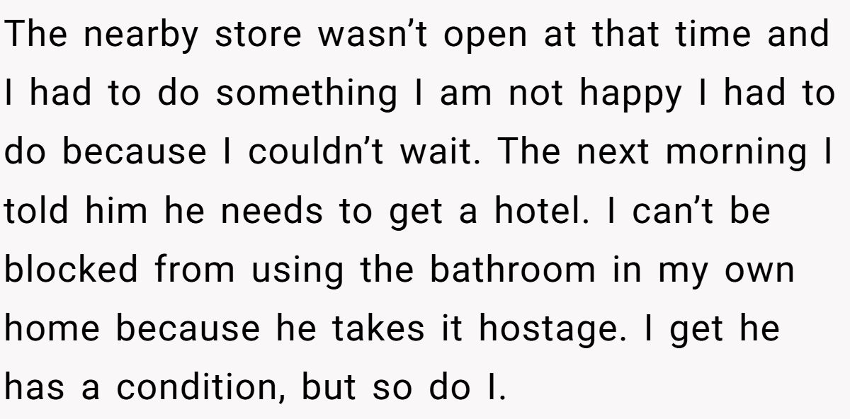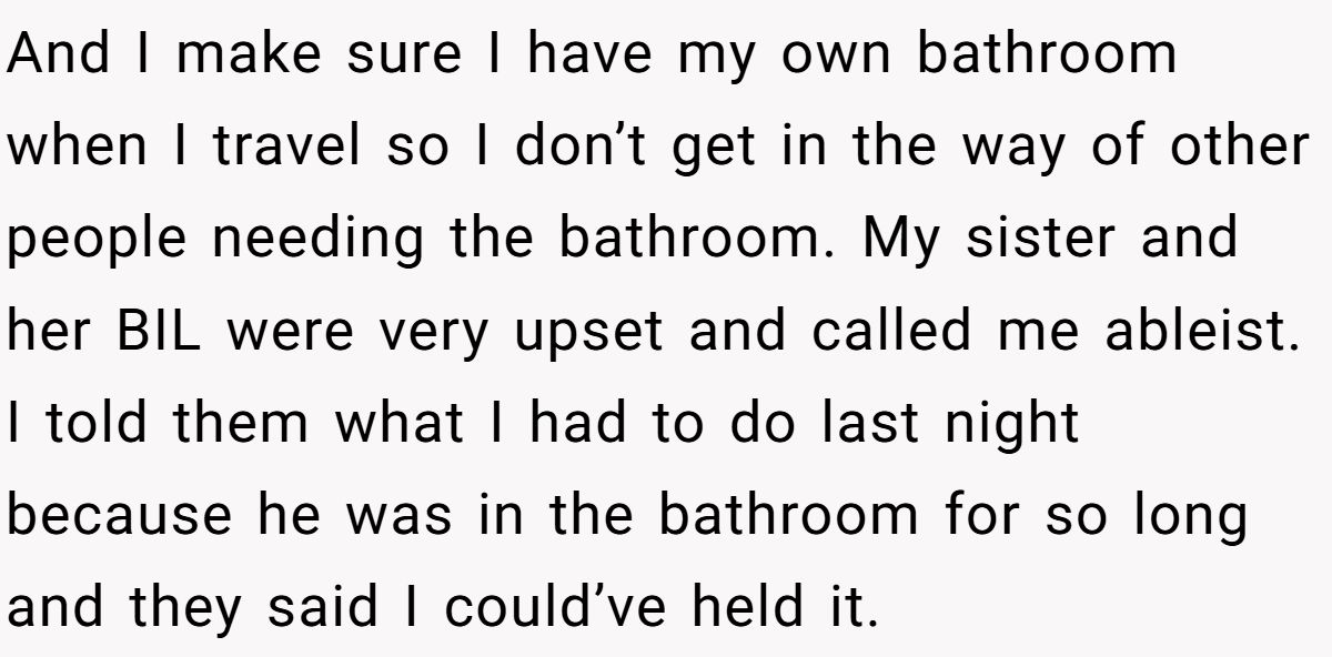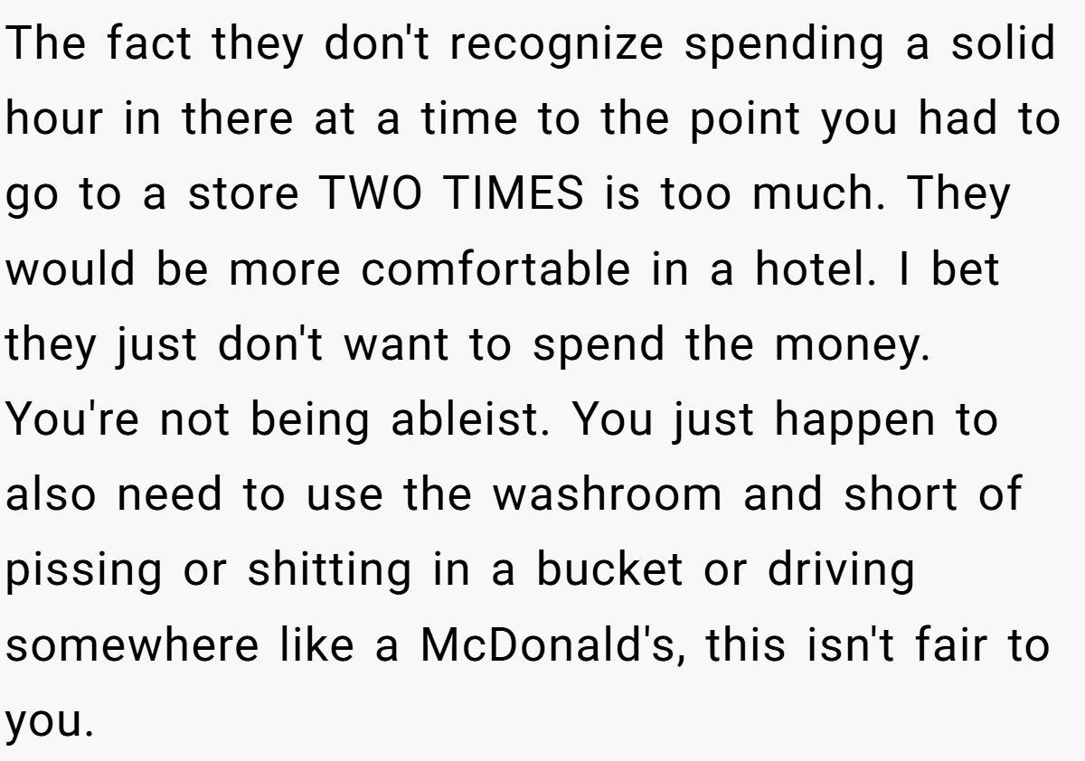 This isn’t ableism. This is someone finally setting boundaries after suffering literal consequences—remember, the OP had to go to a store (twice!) just to relieve herself. And when that didn’t work, she was left with no choice but to do something “she wasn’t proud of.”