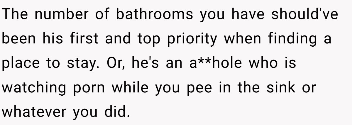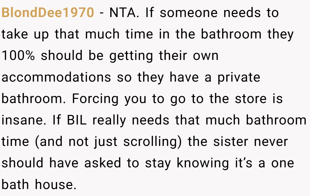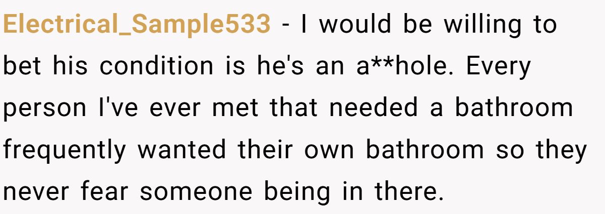 Let’s be real: everyone deserves privacy and comfort, especially when dealing with medical conditions. But monopolizing someone else’s only bathroom, forcing them to leave their own home just to pee? That’s not a condition—it’s inconsideration. And the kicker? When confronted, the BIL and sister flipped the narrative and accused the host of being “ableist,” completely ignoring her needs in the process.