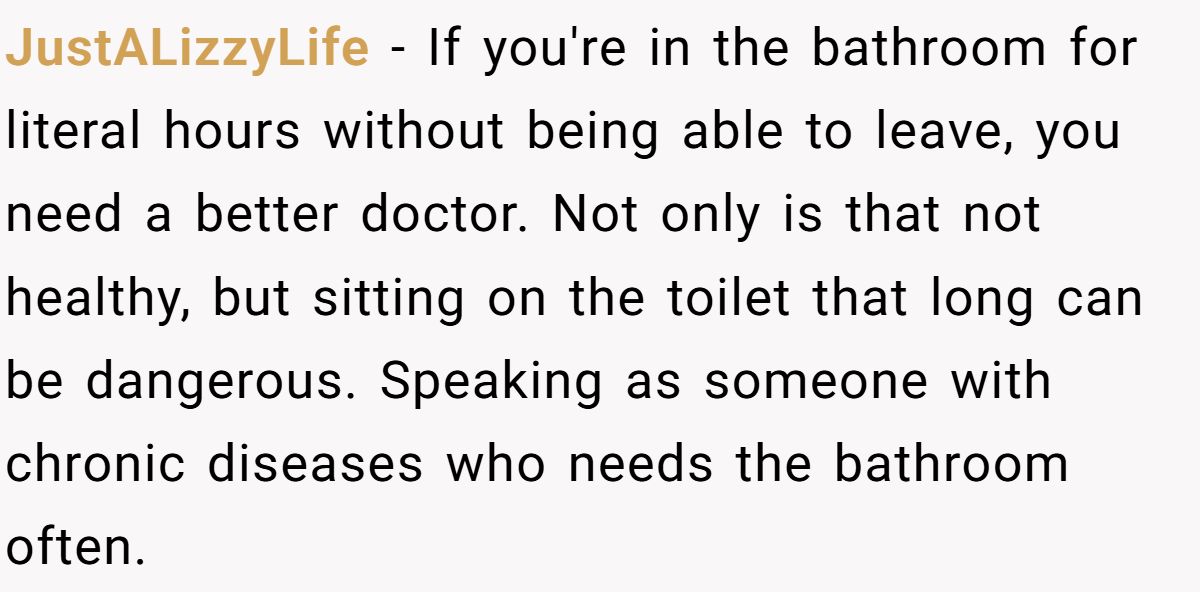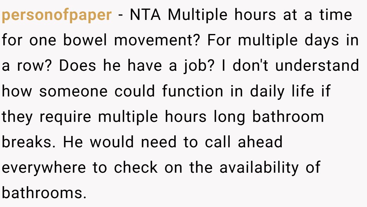 A few Redditors doubted the bathroom marathon was health-related. Instead, they suggested he was scrolling, avoiding responsibilities, or possibly dealing with something more serious.