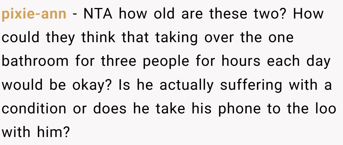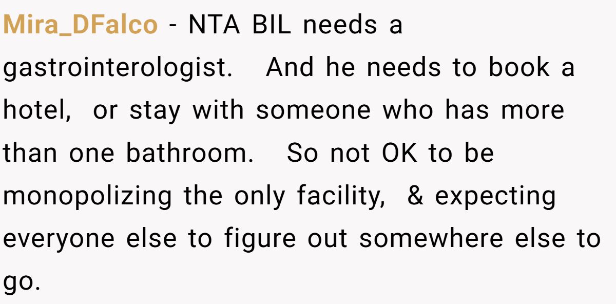 One woman’s frustration with her brother-in-law’s marathon bathroom sessions led to a heated demand for a hotel stay.