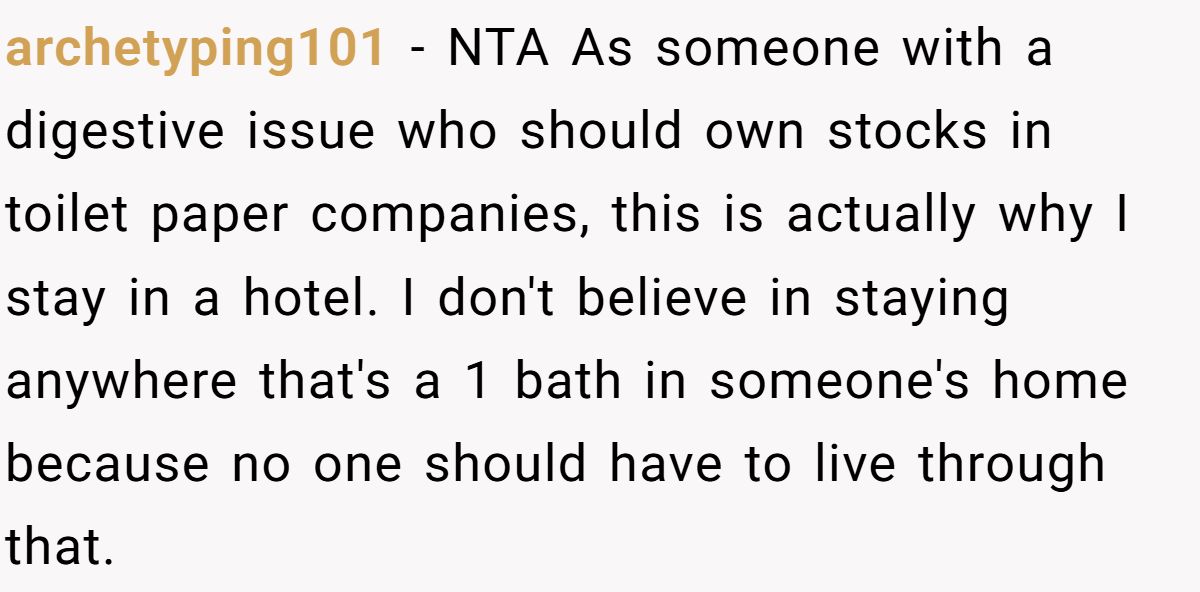 This bathroom battle was more than a plumbing problem—it was a test of boundaries and basic respect. While family visits should bring connection, not conflict, the reality is that even love has limits. Should the Redditor have been more understanding—or was she right to finally flush the freeloading behavior for good?
