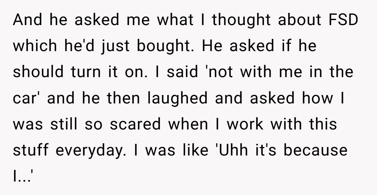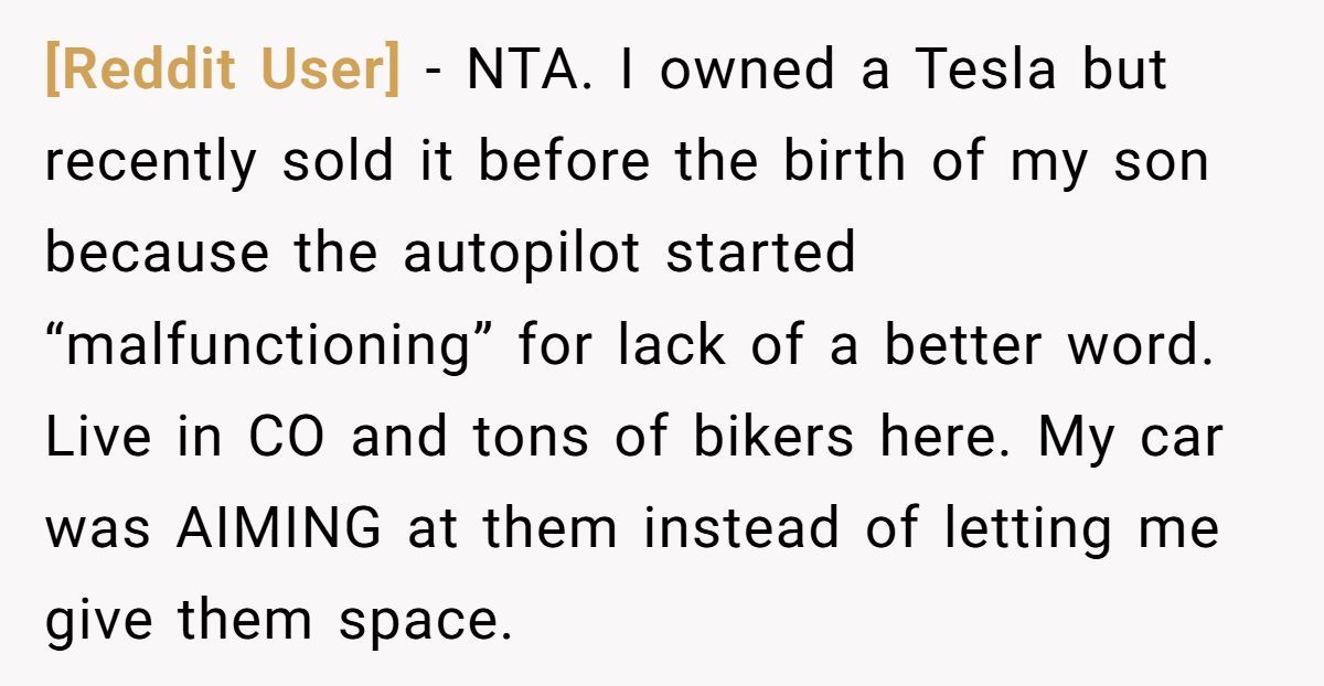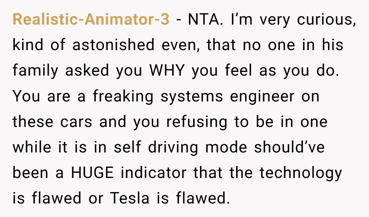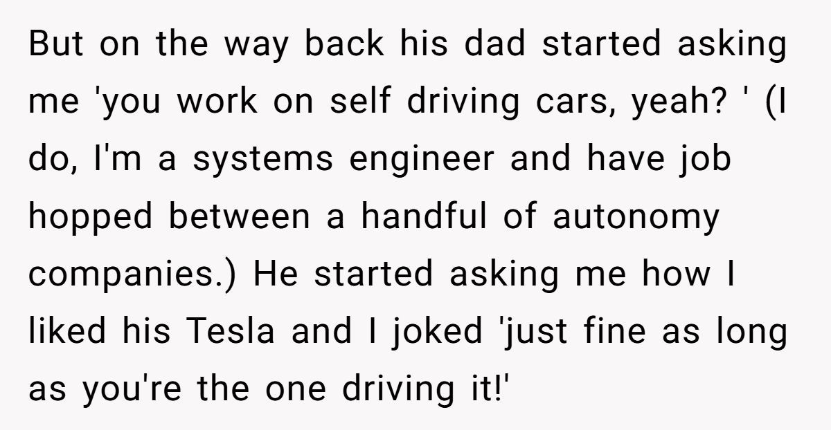 One Redditor found herself at the center of a family car ride that turned from mildly awkward to emotionally alarming—and it all started with a Tesla. A systems engineer, who works with self-driving technology, asked her boyfriend’s dad not to turn on Full Self-Driving. Sounds simple enough, right?