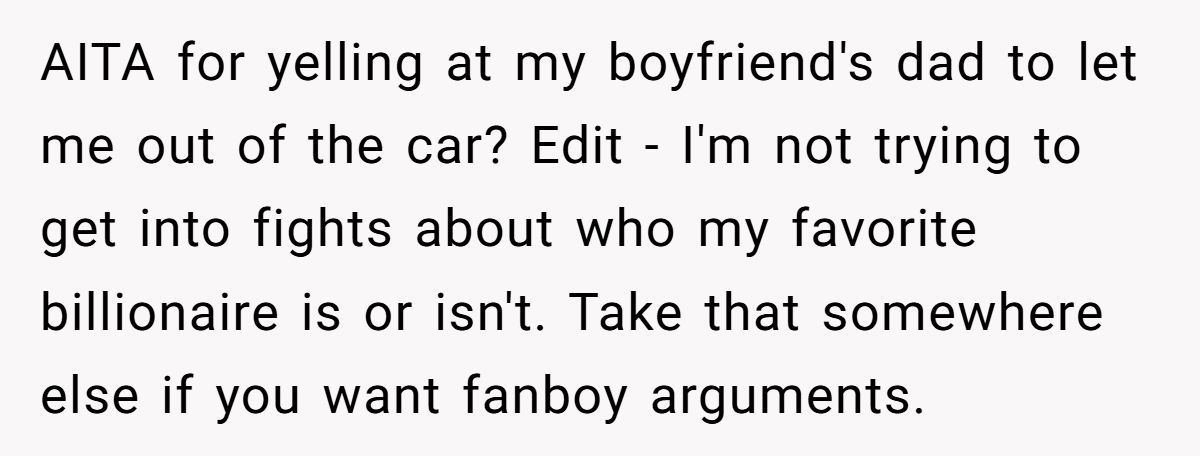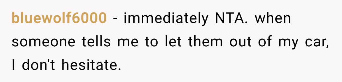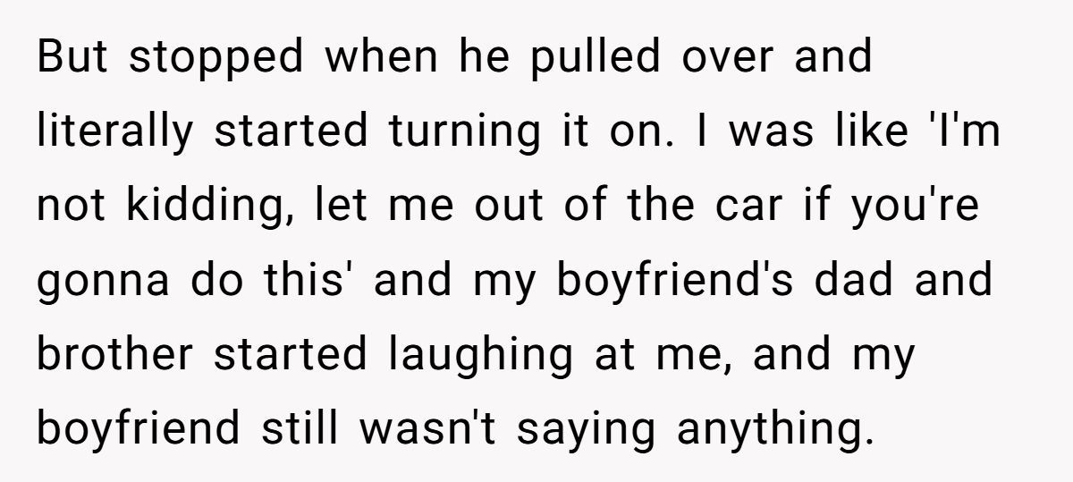 But instead of respecting her boundary, her boyfriend’s dad and brother decided to turn it into a punchline. He locked the doors, flicked on the FSD feature, and laughed. Trapped, tipsy, and feeling humiliated, she did the only thing she could think of—yelled to be let out. Now everyone’s acting like she’s the problem. Want the full ride? Buckle up.