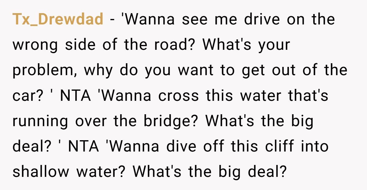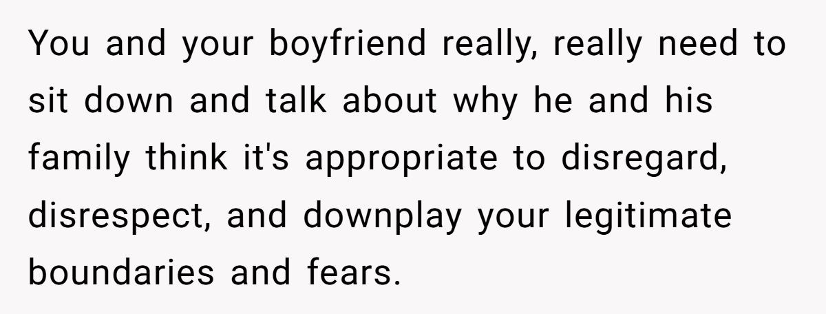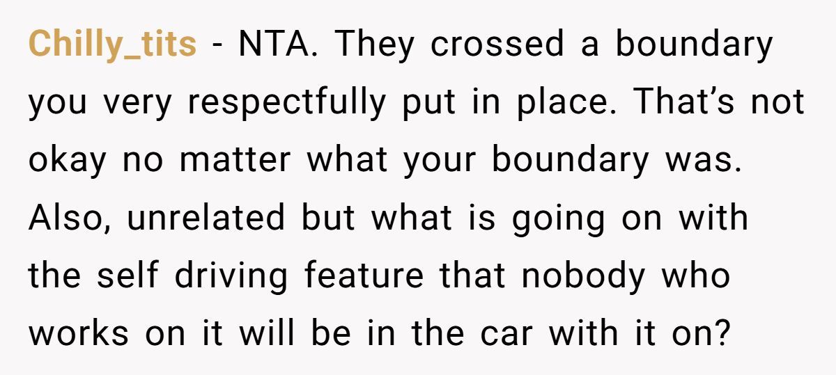 Let’s talk consent and control. According to Psych Central, boundaries are more than personal preferences—they’re non-negotiable limits that protect our emotional and physical well-being (source). The Redditor clearly communicated her boundary: don’t turn on Full Self-Driving. Her boyfriend’s dad chose to ignore that, laugh, and override her consent.