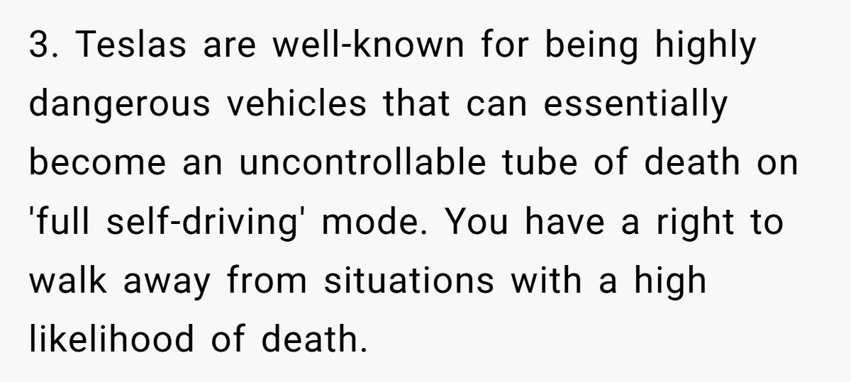 Some claimed the family’s laughter and FSD use endangered her, advising her to prioritize her safety