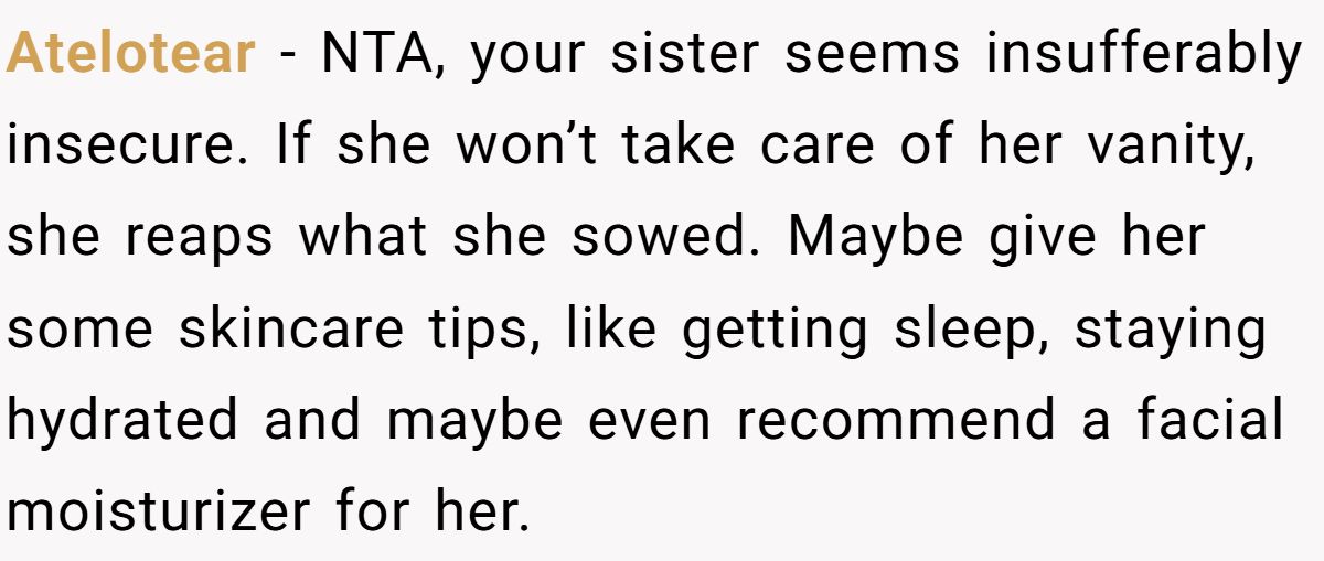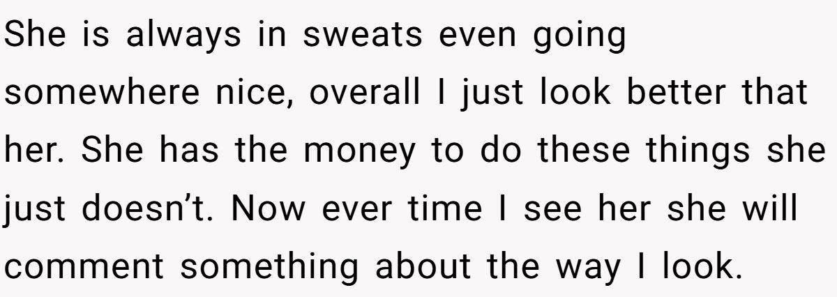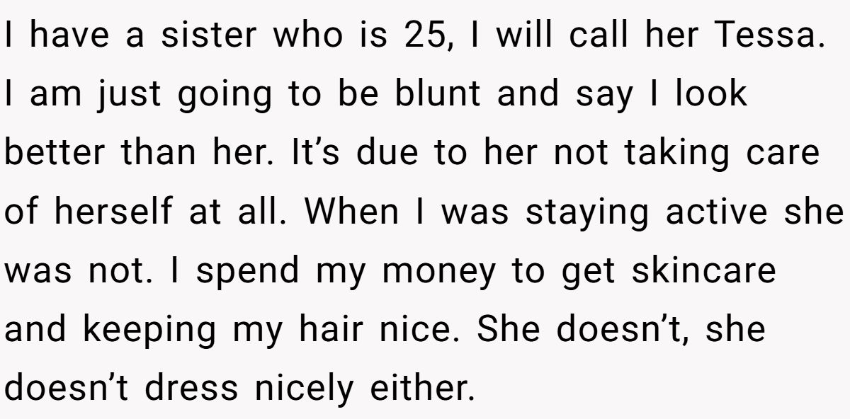 According to the OP, she’s always taken care of her appearance, from skincare to style, while her sister—whom she refers to as “Tessa”—has never shown much interest in that. The difference in how people respond to them has become a major point of tension.