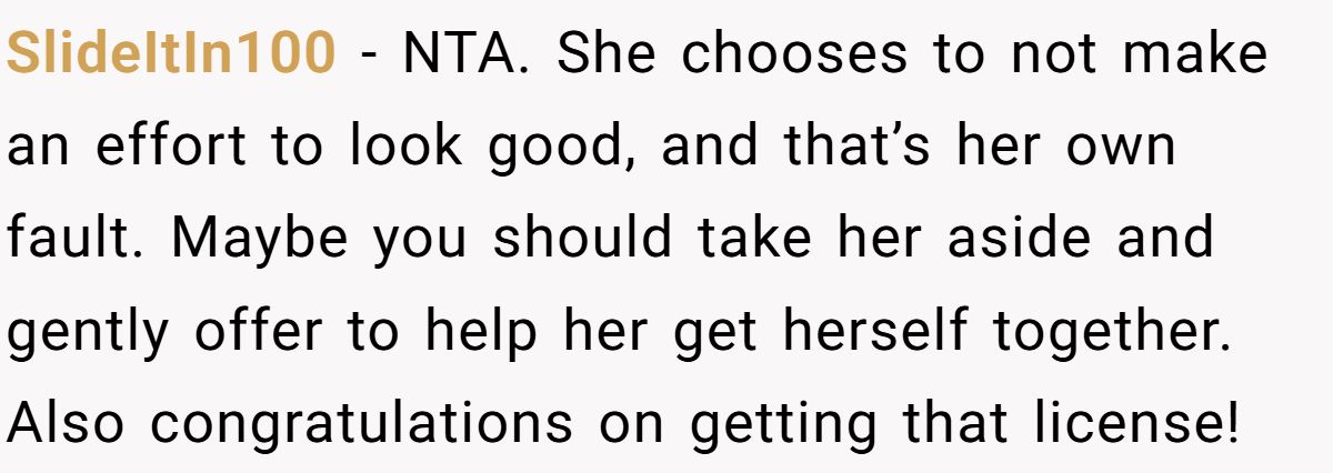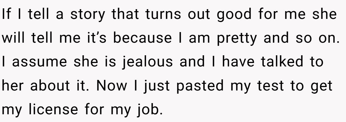 The sister’s comments likely stem from low self-esteem, projecting her dissatisfaction onto the Redditor’s polished appearance. But dismissing a hard-earned job license as a looks-based win was a low blow. The Redditor’s effort in skincare, fitness, and style doesn’t negate her achievements, but calling her sister “ugly” was a cruel jab that hit an already sore spot.
