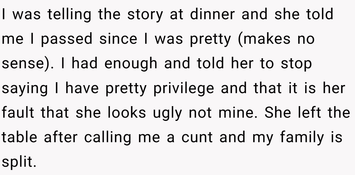 One woman shared on Reddit how her sister’s constant “pretty privilege” remarks led to a cruel comeback that divided their family
