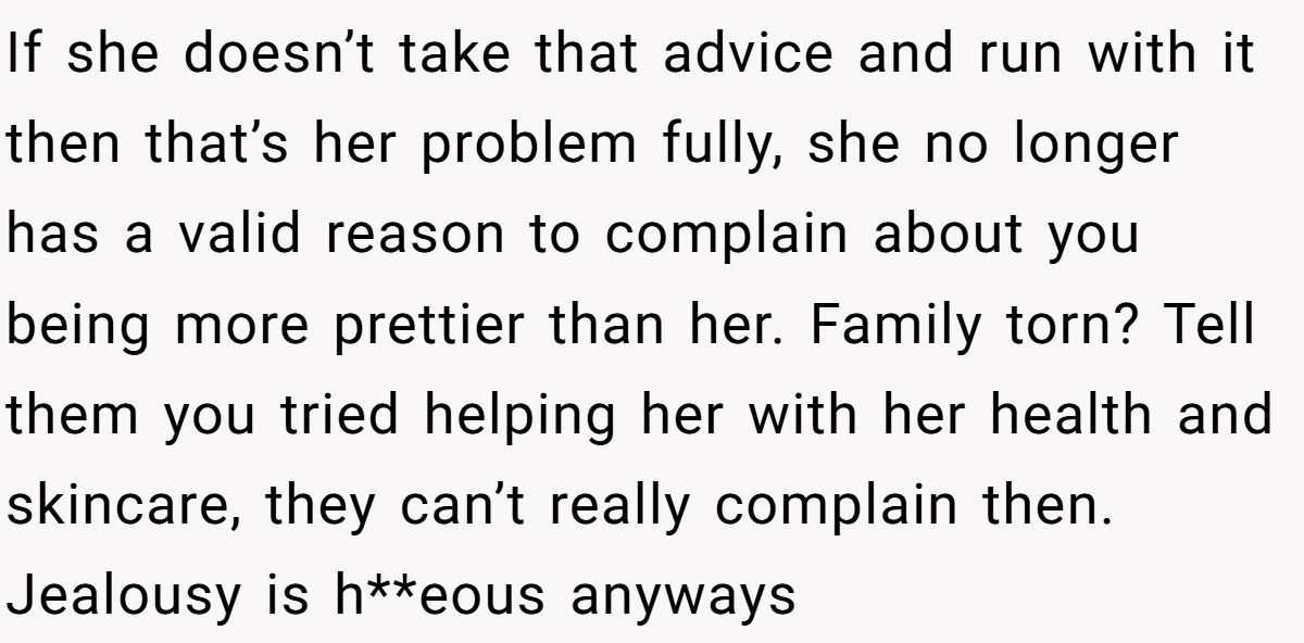 Users saw the sister’s “pretty privilege” comments as envious and unfair, with one suggesting offering skincare tips to help her self-esteem