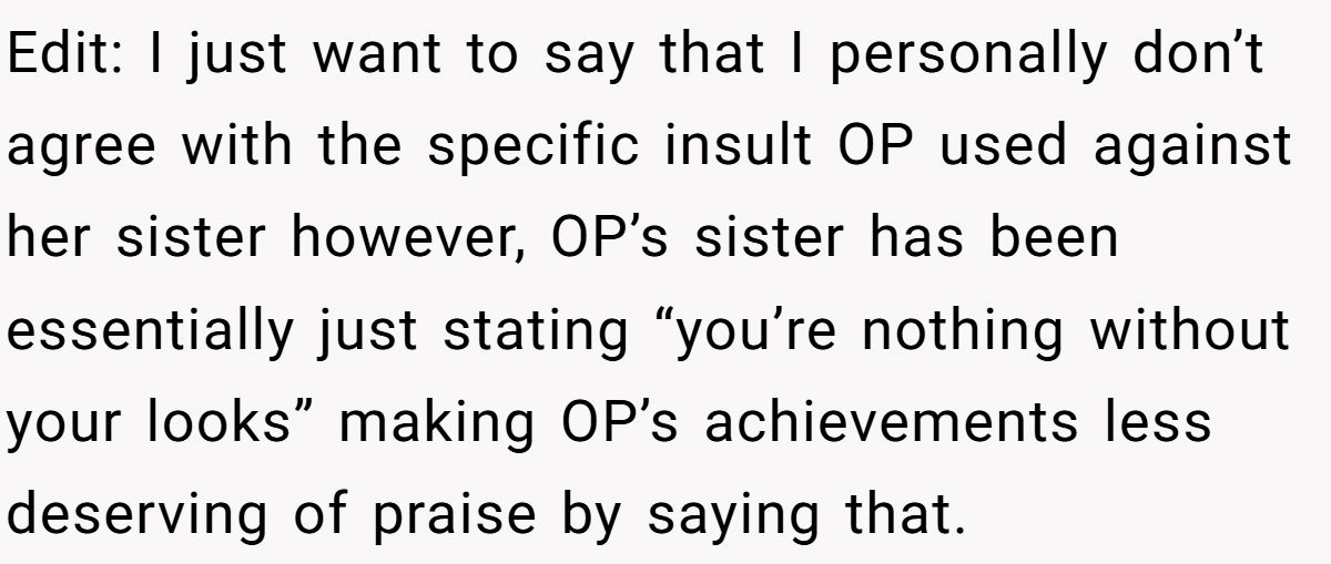 This situation is a messy blend of insecurity, misdirected envy, and years of unresolved sibling tension. OP is clearly tired of being reduced to her looks—especially when it undermines her hard work. But telling someone they “look ugly” is a sharp cut, especially when they’re already insecure.