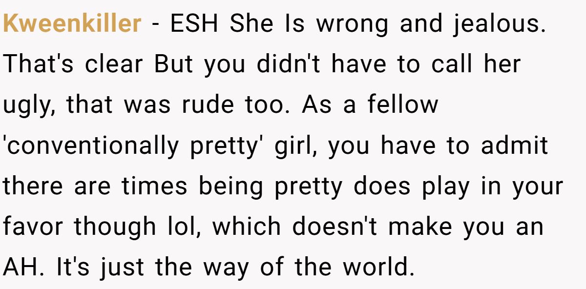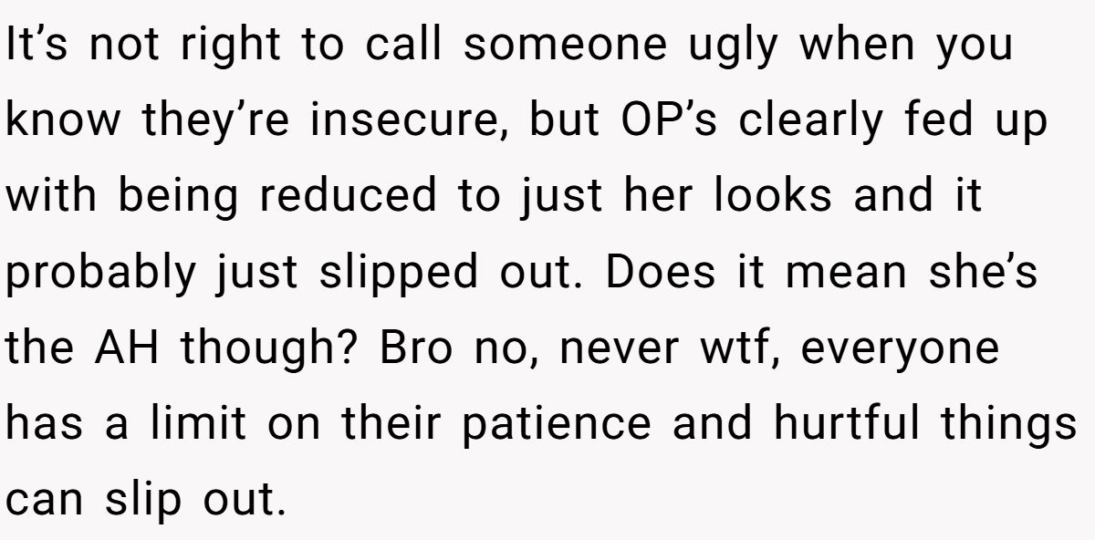 Reddit’s take? You’re not wrong for feeling hurt. But the way you delivered the truth might’ve pushed things too far. Some wounds don’t heal with more cutting. If rebuilding the relationship is the goal, it might be time to talk again—less about who’s “pretty” and more about what’s really going on.