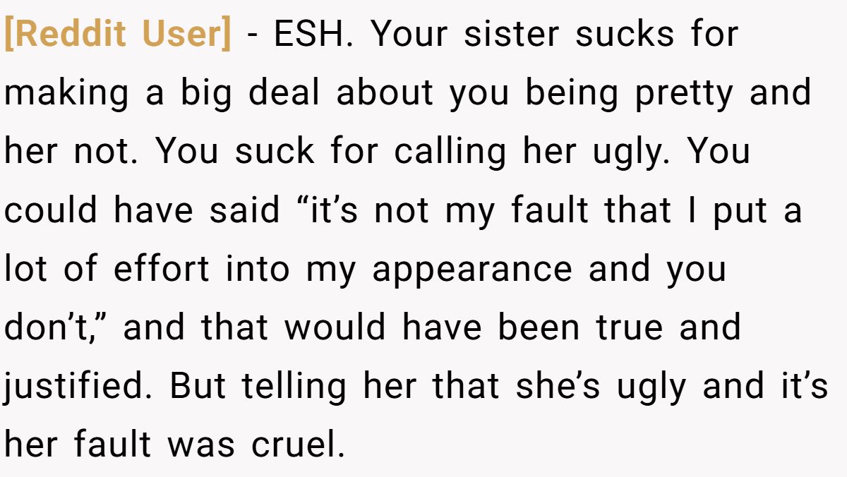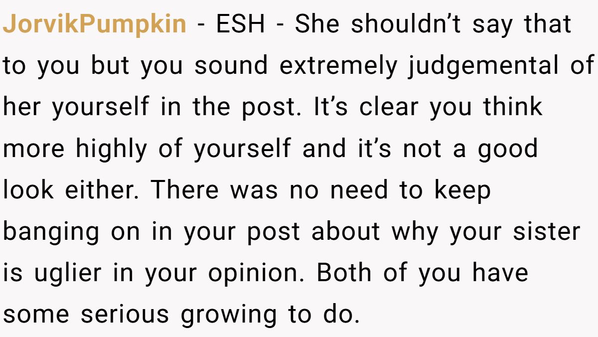 Commenters labeled it ESH (Everyone Sucks Here), noting the sister’s remarks were wrong but the “ugly” insult was cruel