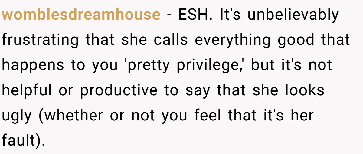 Tessa constantly claims her sister only succeeds because of “pretty privilege,” even when it makes no sense—like passing a licensing exam. Eventually, OP had enough and snapped: she told Tessa it was her own fault for “looking ugly.” Now the family is split, and OP’s wondering if she went too far.