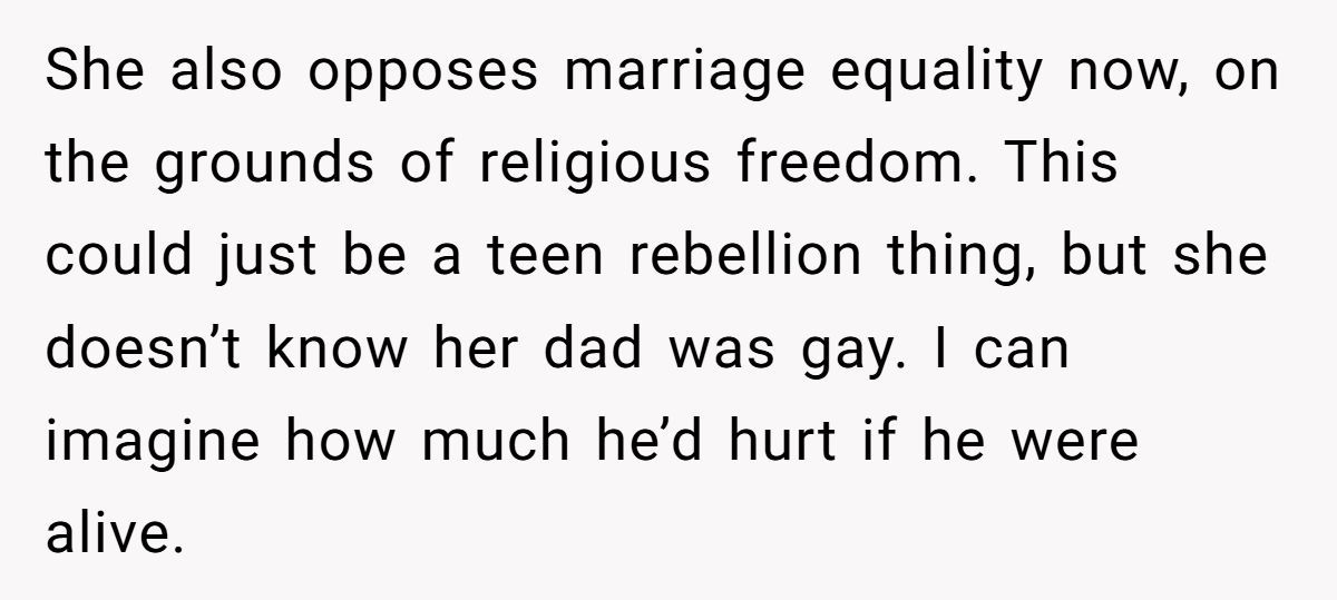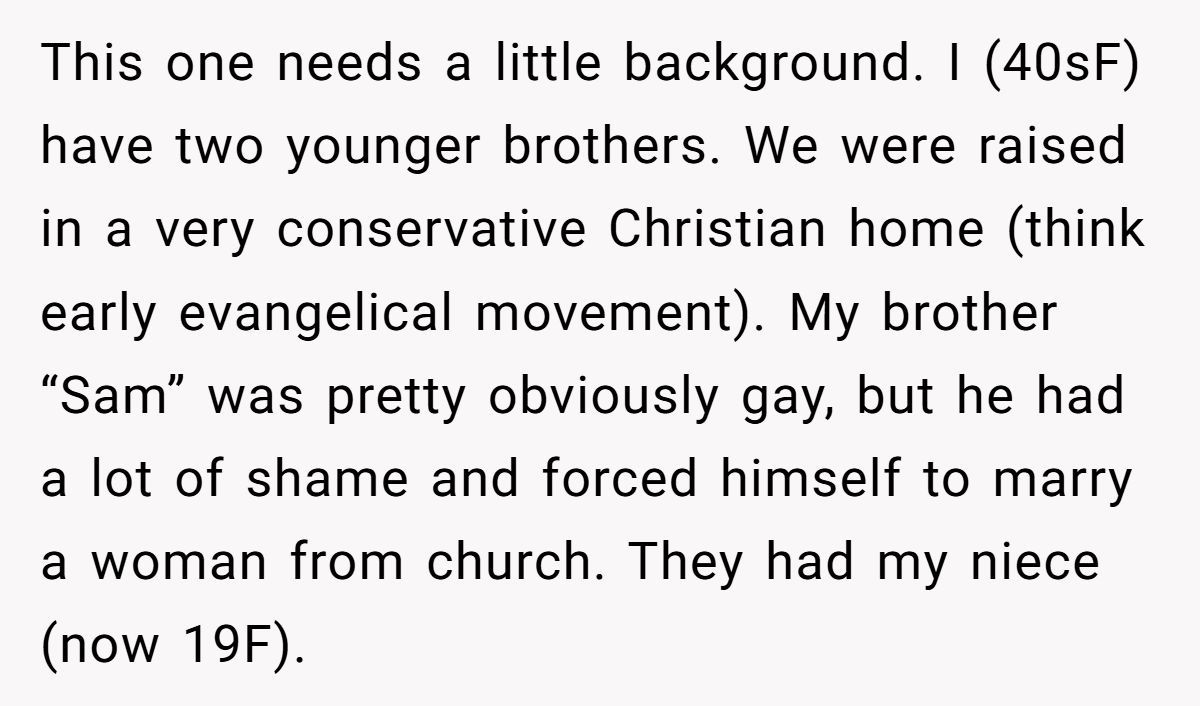 The niece, raised without religion, now says she opposes marriage equality—despite her father having been secretly gay. That father died of an overdose after years of shame, which the aunt links directly to their conservative Christian upbringing. With emotions running high, the aunt is considering halting her financial support entirely.