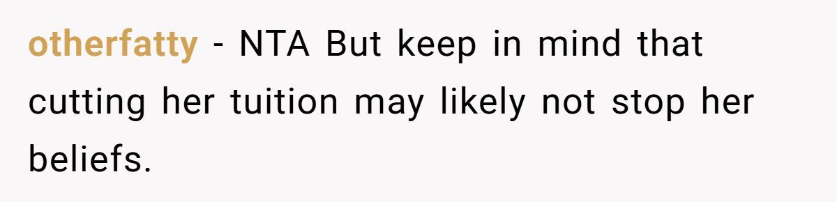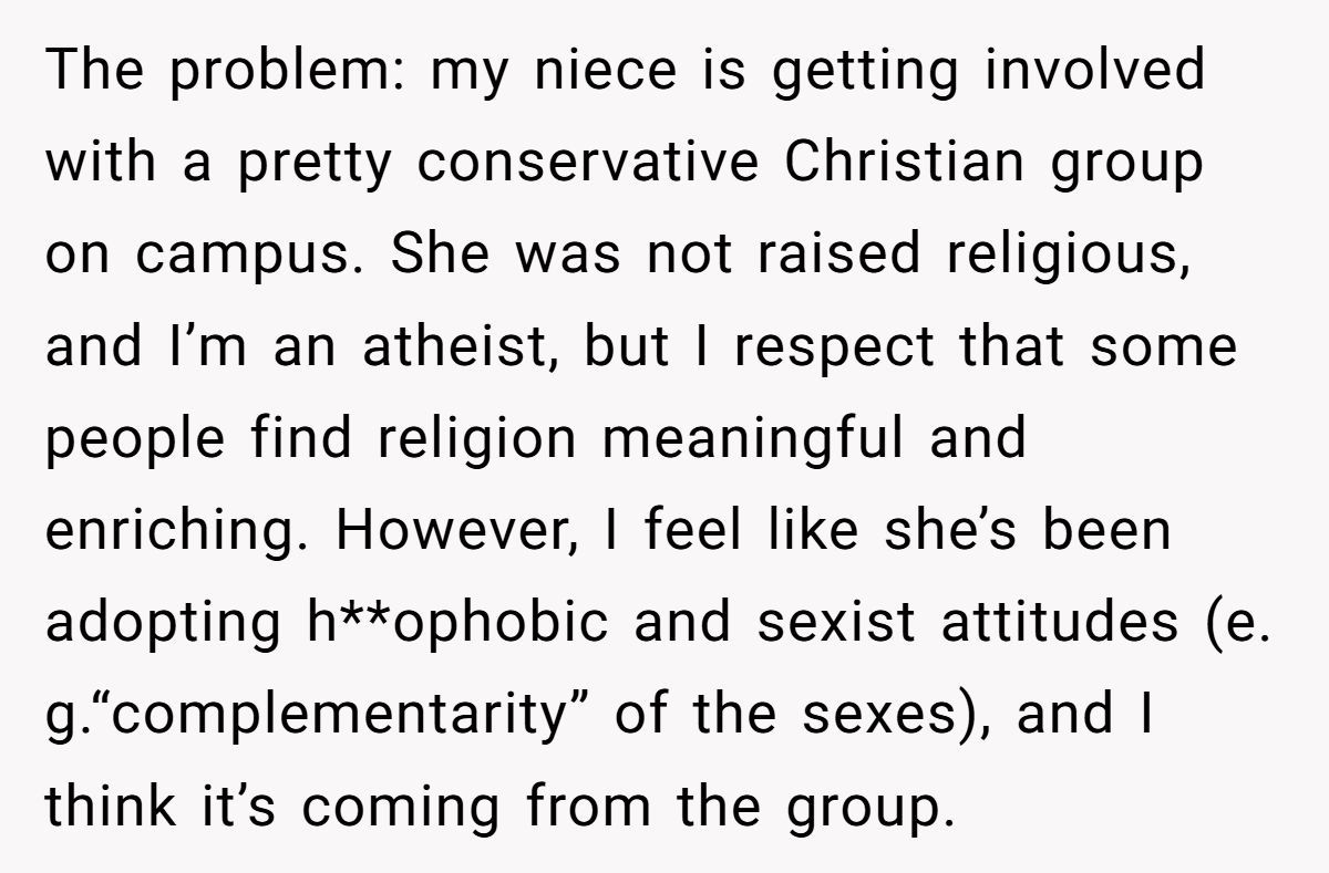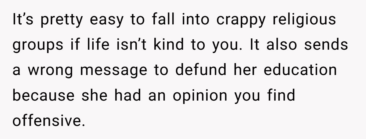 Ideological shifts in young adults are common but tricky. A 2023 study in the Journal of Social Psychology found that 30% of college students explore extreme beliefs as part of identity formation, often softening with exposure to diverse views. Cutting tuition risks pushing her niece deeper into the group, as commenters warned, especially since her beliefs echo the shame that harmed her father. The Redditor’s atheist stance and close family ties make this personal.