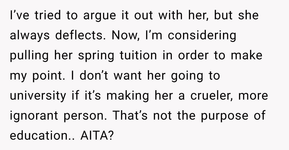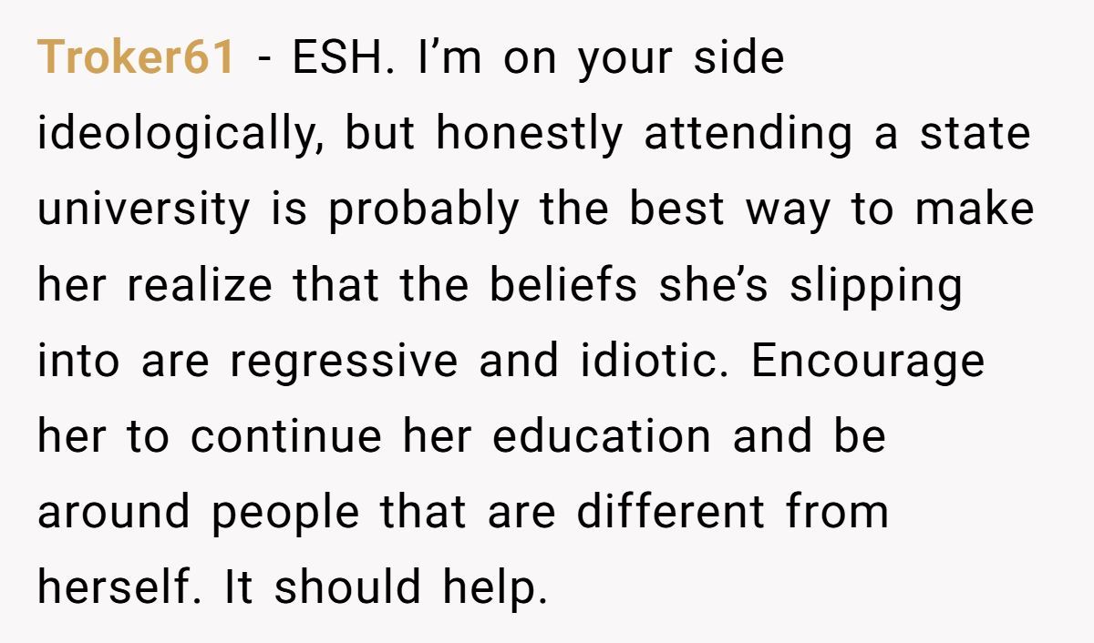 What’s the fix? Share her father’s story gently, as one commenter suggested, to highlight the harm of her beliefs without confrontation. Continue funding tuition to keep her in a diverse university environment, which may broaden her perspective. Suggest attending a campus event together, like a diversity panel, to spark discussion.