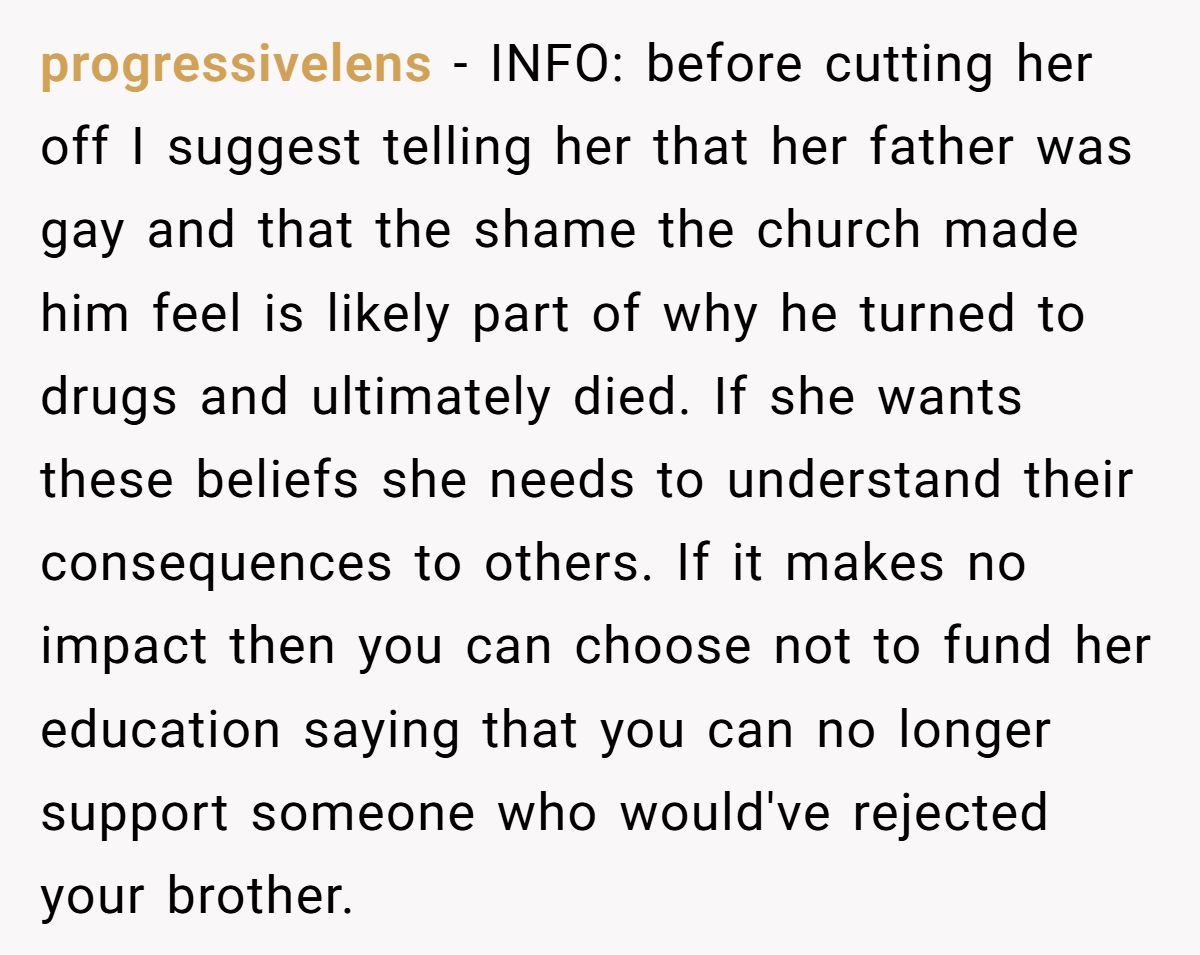 This Redditor, a generous aunt funding her niece’s state university tuition, is heartbroken as her niece embraces homophobic and sexist beliefs from a campus Christian group. Knowing her late brother—her niece’s father—was gay and suffered from religious shame, she’s torn about withdrawing financial support to make a point, fearing college is making her niece “crueler.” Her niece’s refusal to engage in debate adds to the strain.