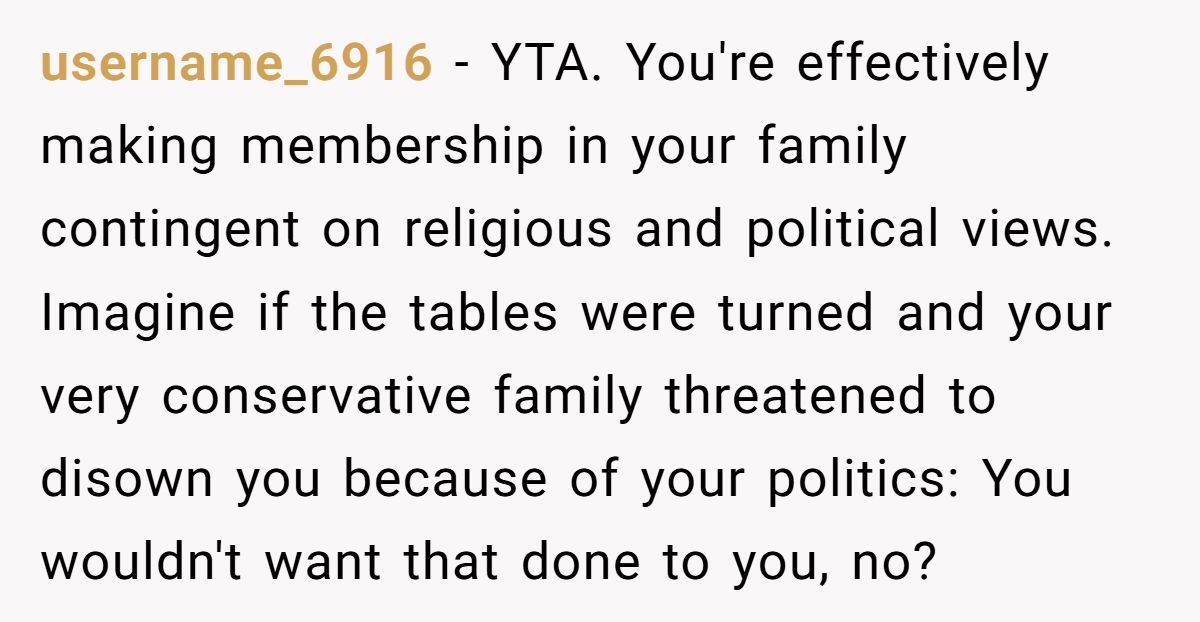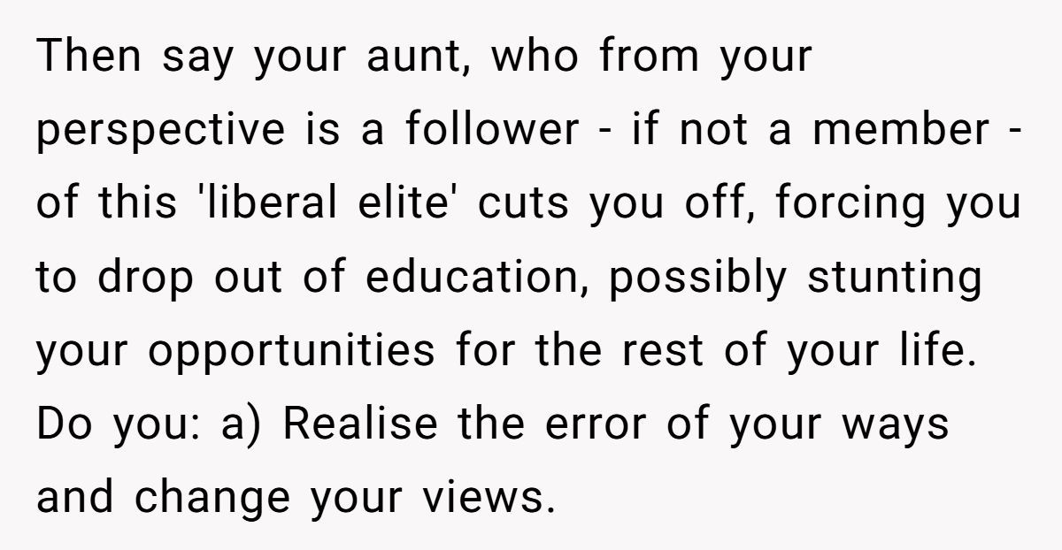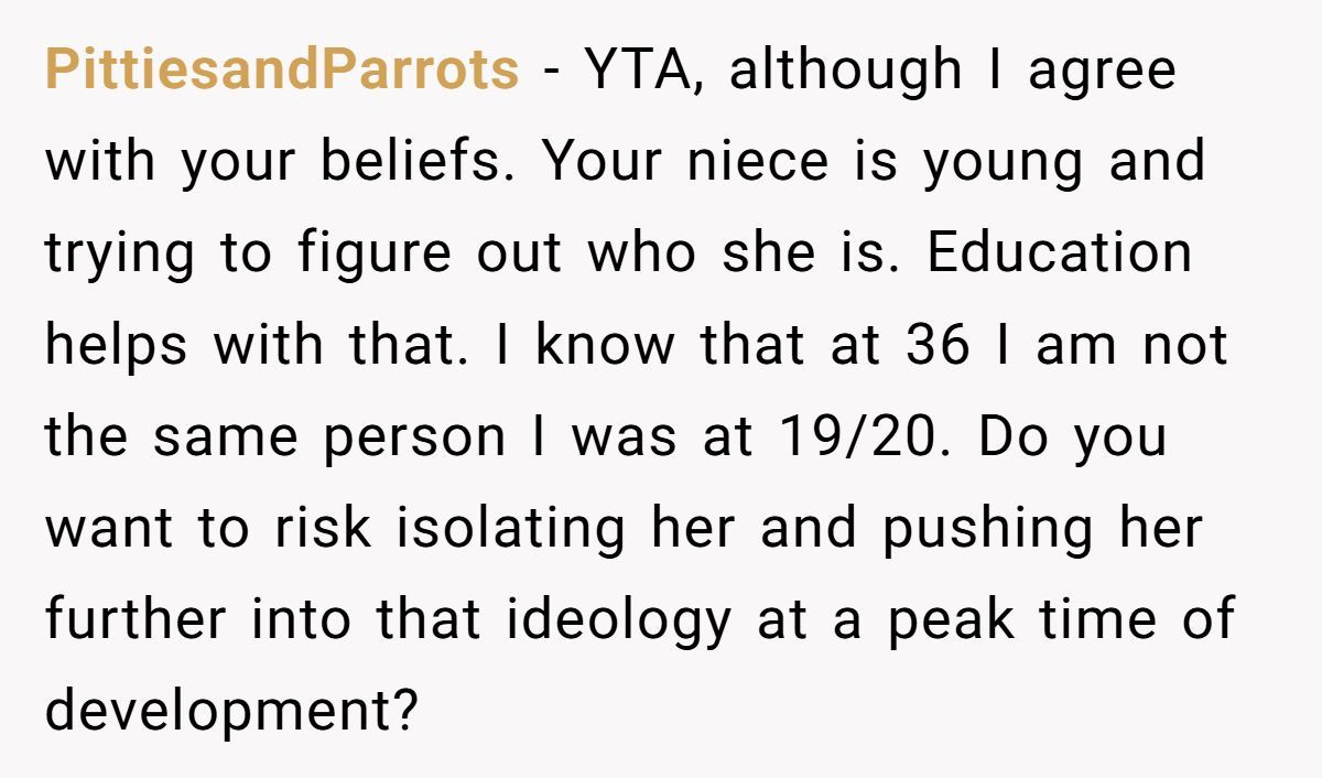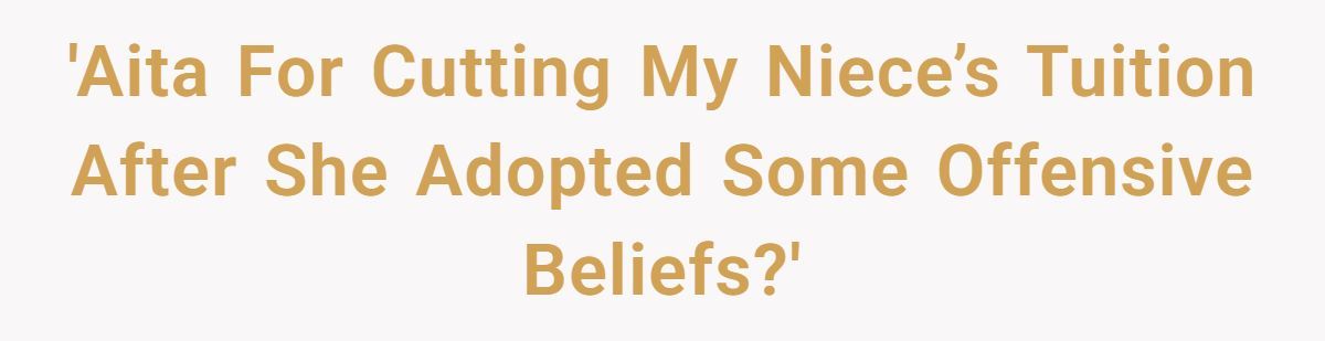 If the beliefs persist, set boundaries on personal interactions without cutting financial support. Readers, would you pull the plug on a niece’s tuition over her views or keep the dialogue open? Let’s dish!