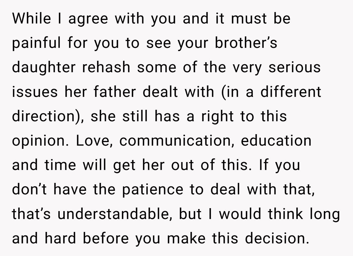 Psychologist Dr. Lisa Damour says, “Challenging a young adult’s beliefs with dialogue, not ultimatums, fosters growth”. This fits—pulling funds may entrench her niece’s views rather than change them. The Redditor’s pain, tied to her brother’s death, is valid, but financial punishment could alienate her niece further, especially at 19, a pivotal age for development.