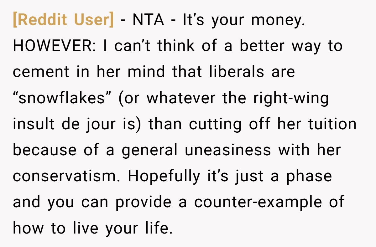 One woman shared on Reddit how her niece’s new conservative beliefs, clashing with her family’s history, led her to consider cutting her college tuition