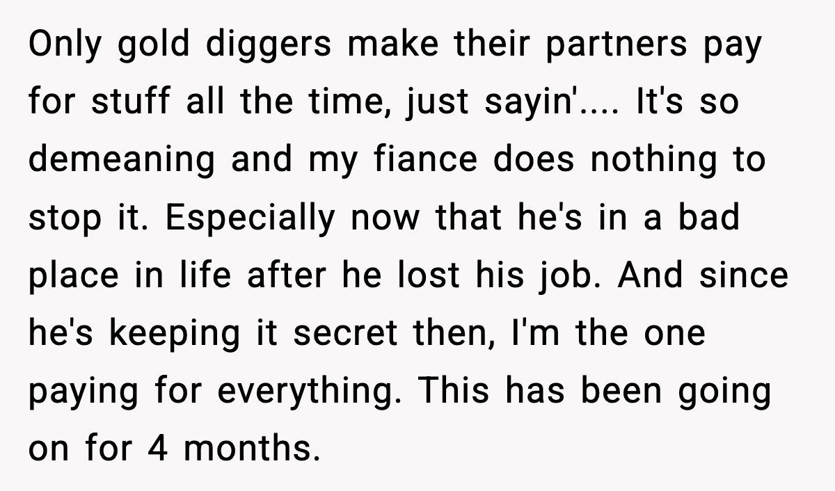 And it’s not just about money. According to a 2023 Pew Research study, 56% of couples report that financial imbalance contributes to relationship stress—but what fuels the fire is when one partner refuses to acknowledge the contributions of the other. In OP’s case, not only was she financially supporting her fiancé, but she was also doing so while being shamed as a “gold digger”—an ironic, insulting contradiction.