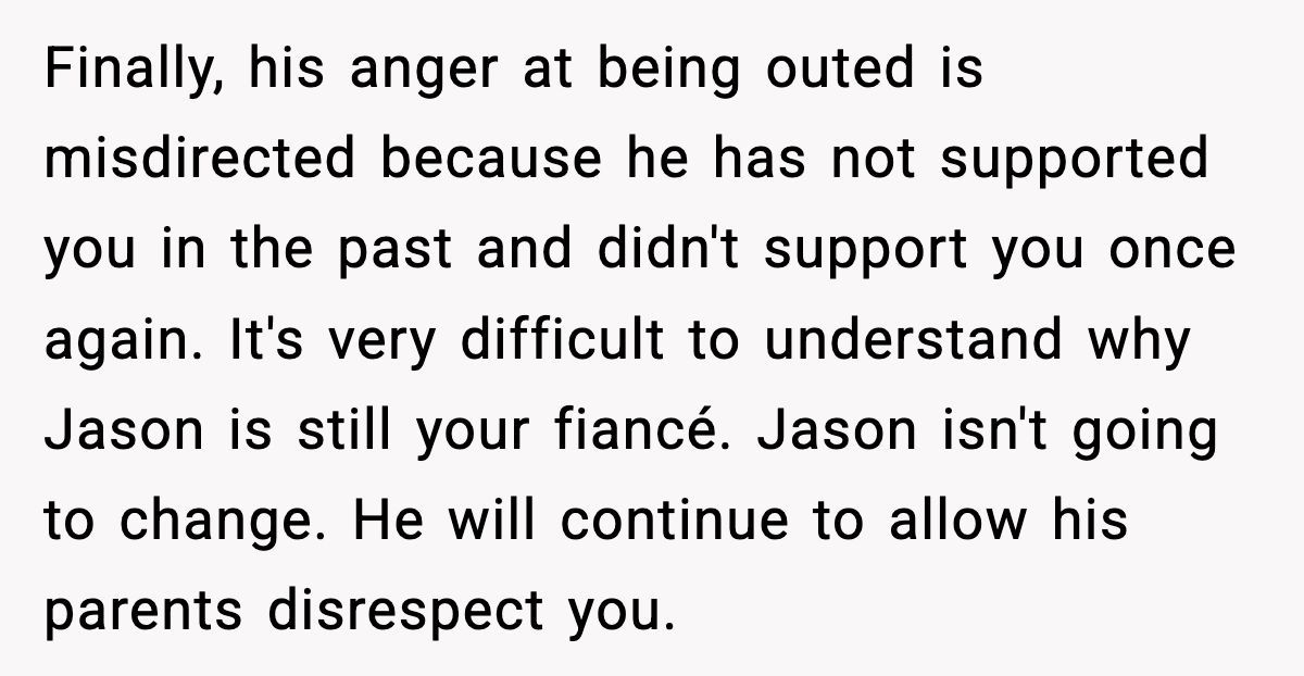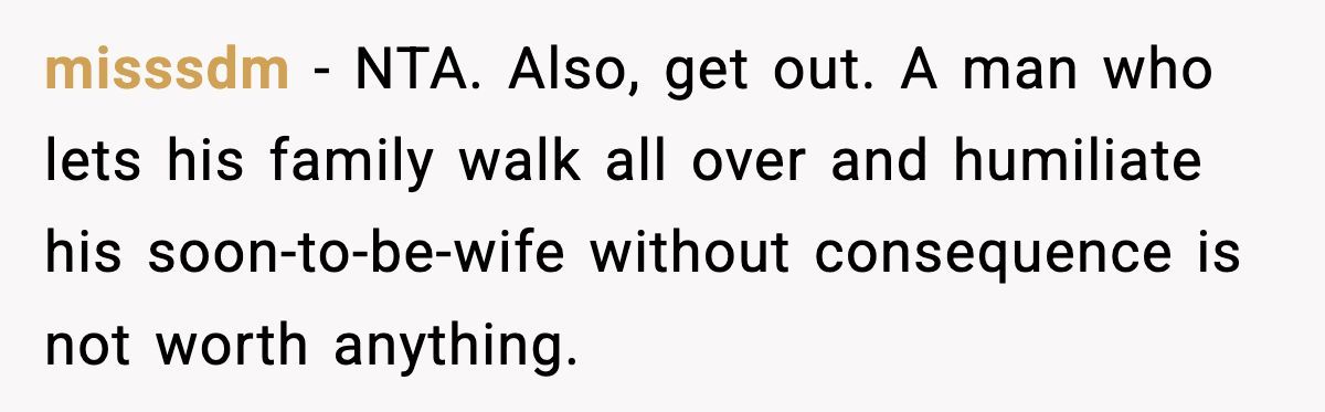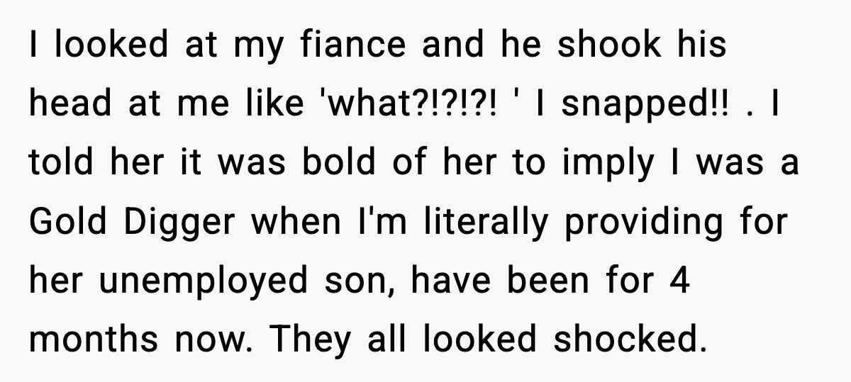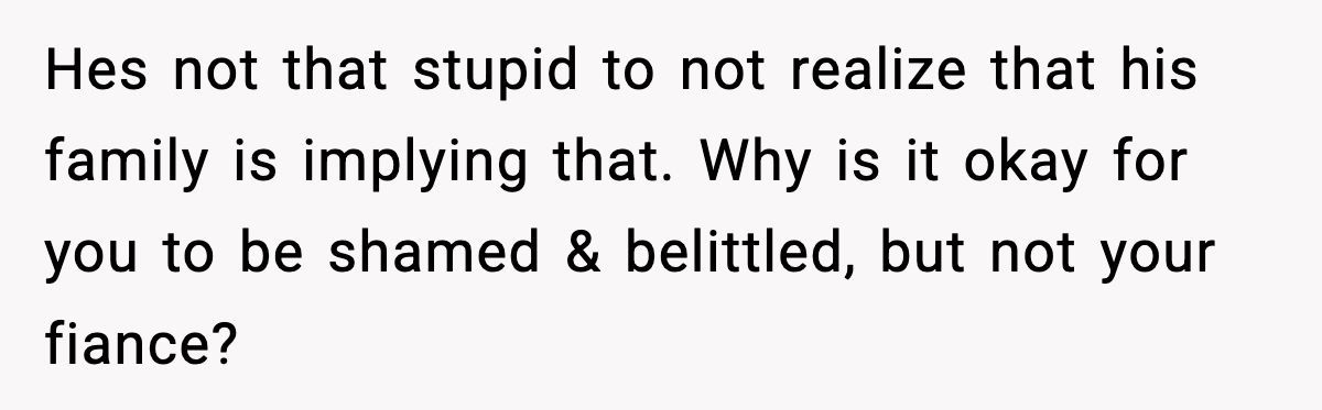 His family’s remarks weren’t subtle. They were calculated digs meant to undermine her dignity and sow insecurity. The real issue here isn’t just financial—it’s about emotional labor and boundaries. Instead of stepping in to shut the behavior down, the fiancé allowed the false narrative to grow. Worse, when the truth finally came out, he redirected his embarrassment as rage toward the very person who had supported him.