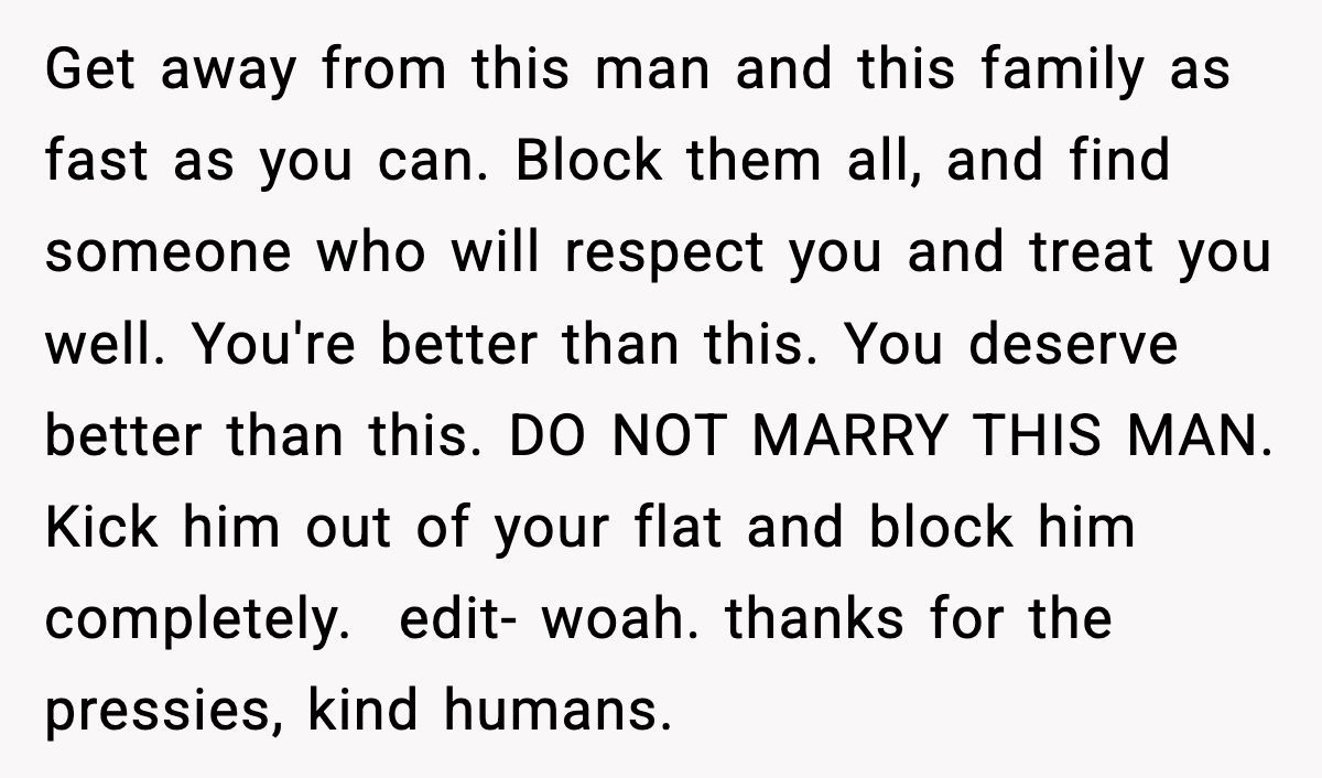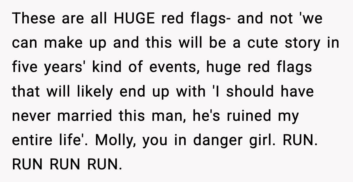 Another labeled the fiance’s gaslighting and rage as major red flags, urging her to run.