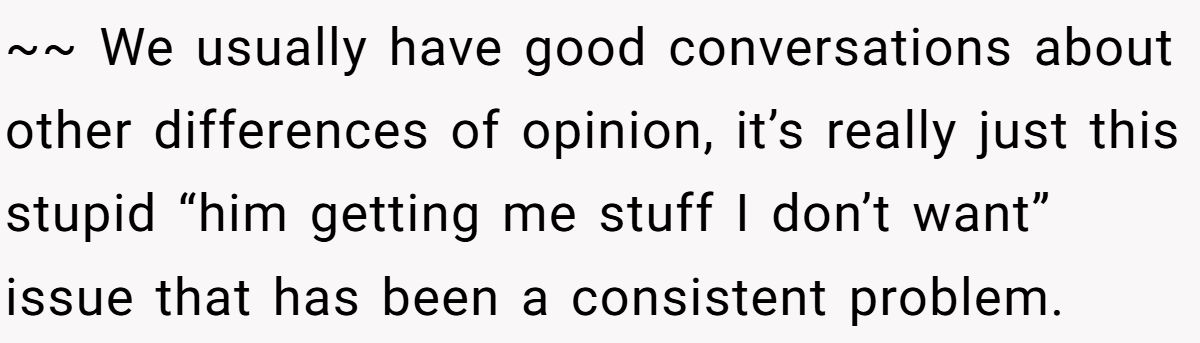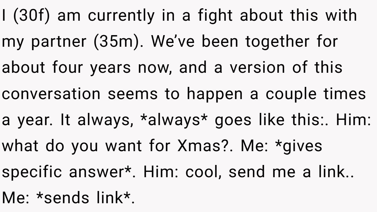 One woman’s anger over her partner’s persistent hand-me-down gifts, despite her specific requests, sparked a heated holiday argument