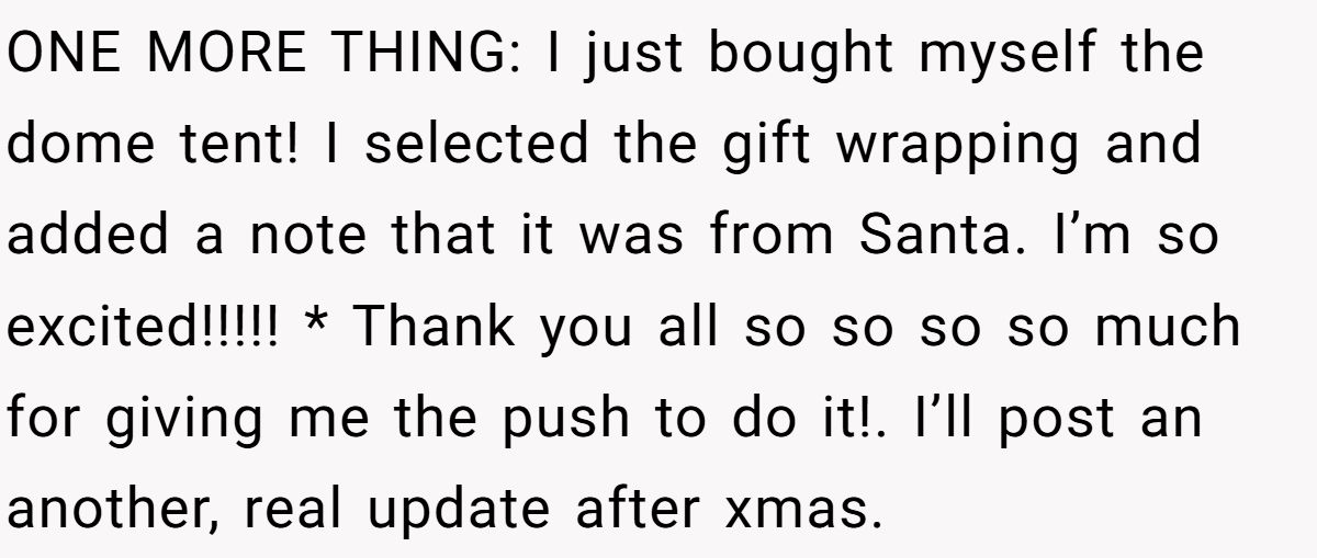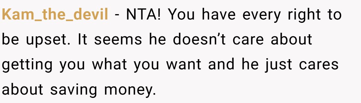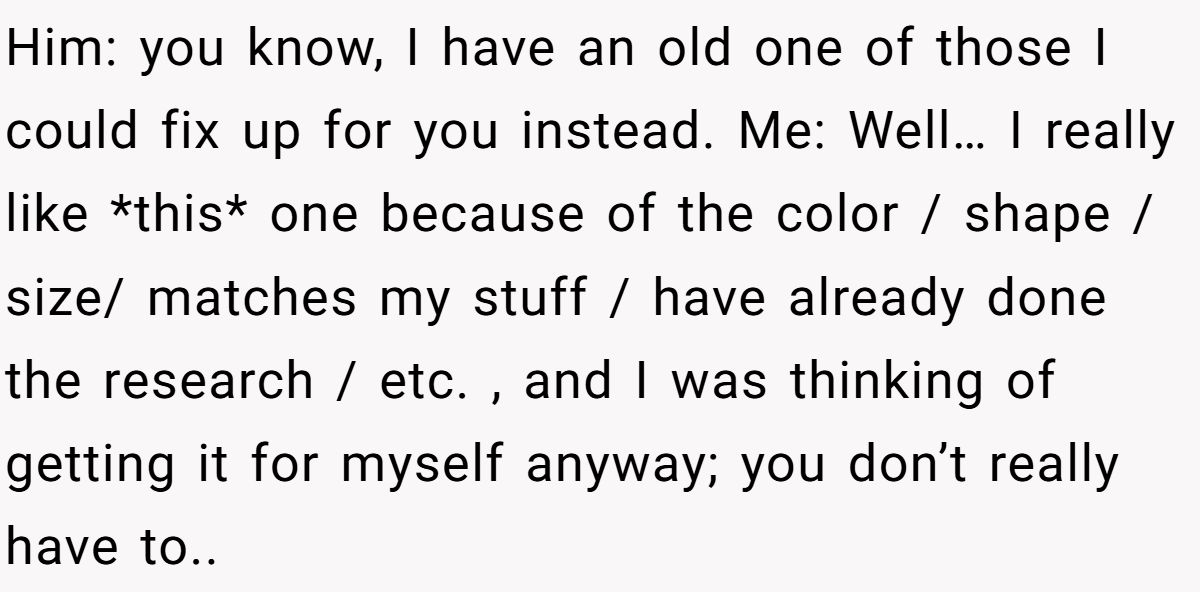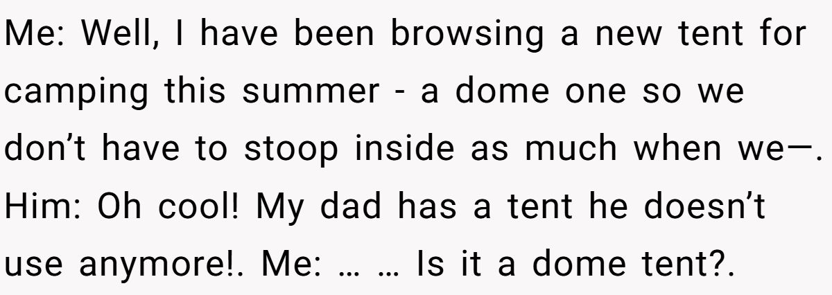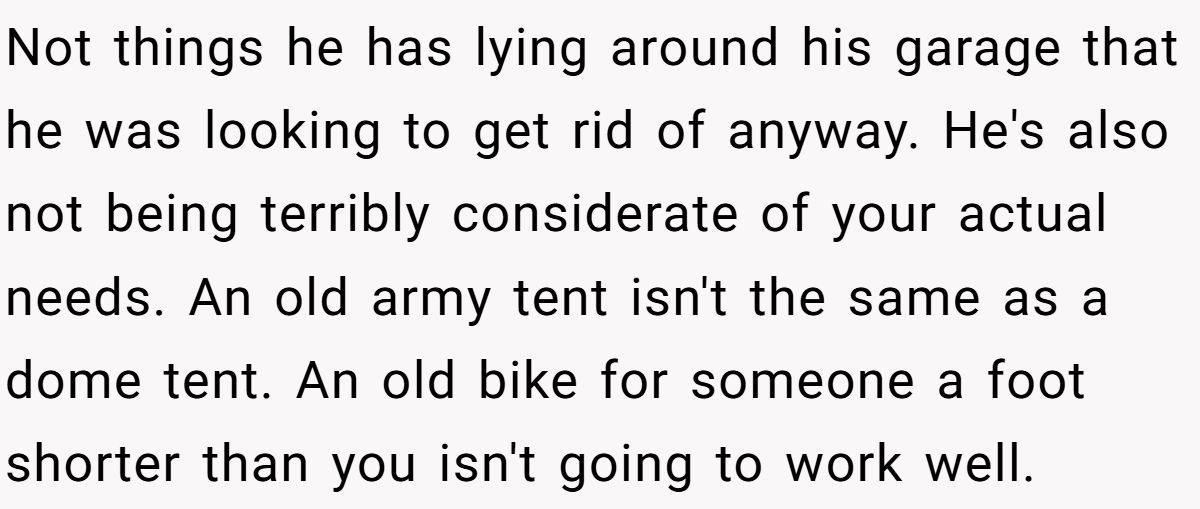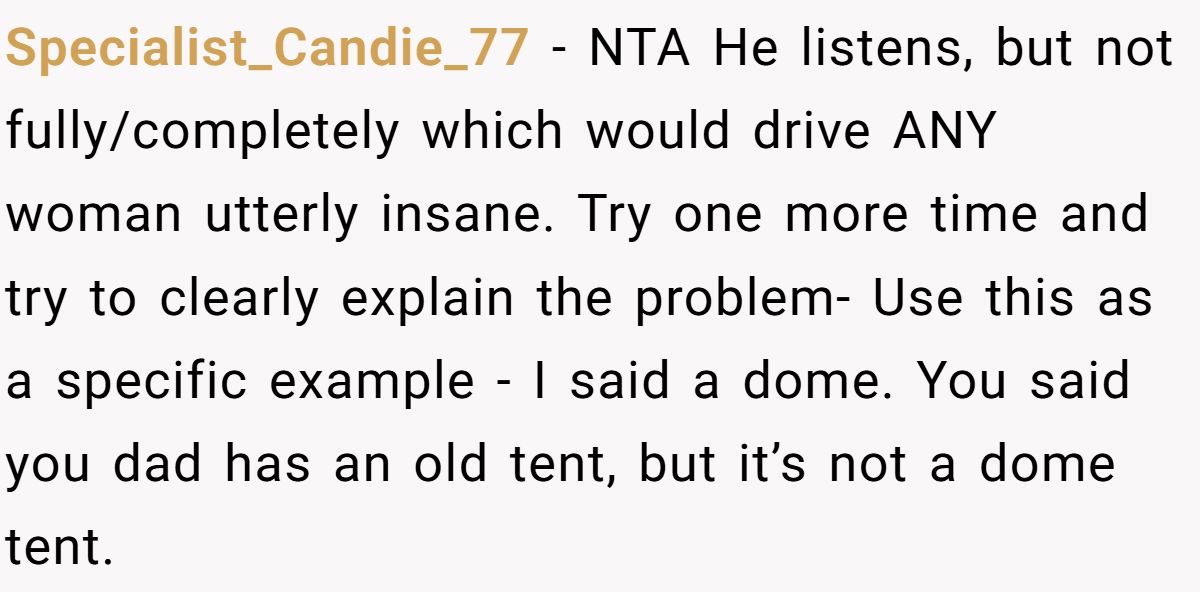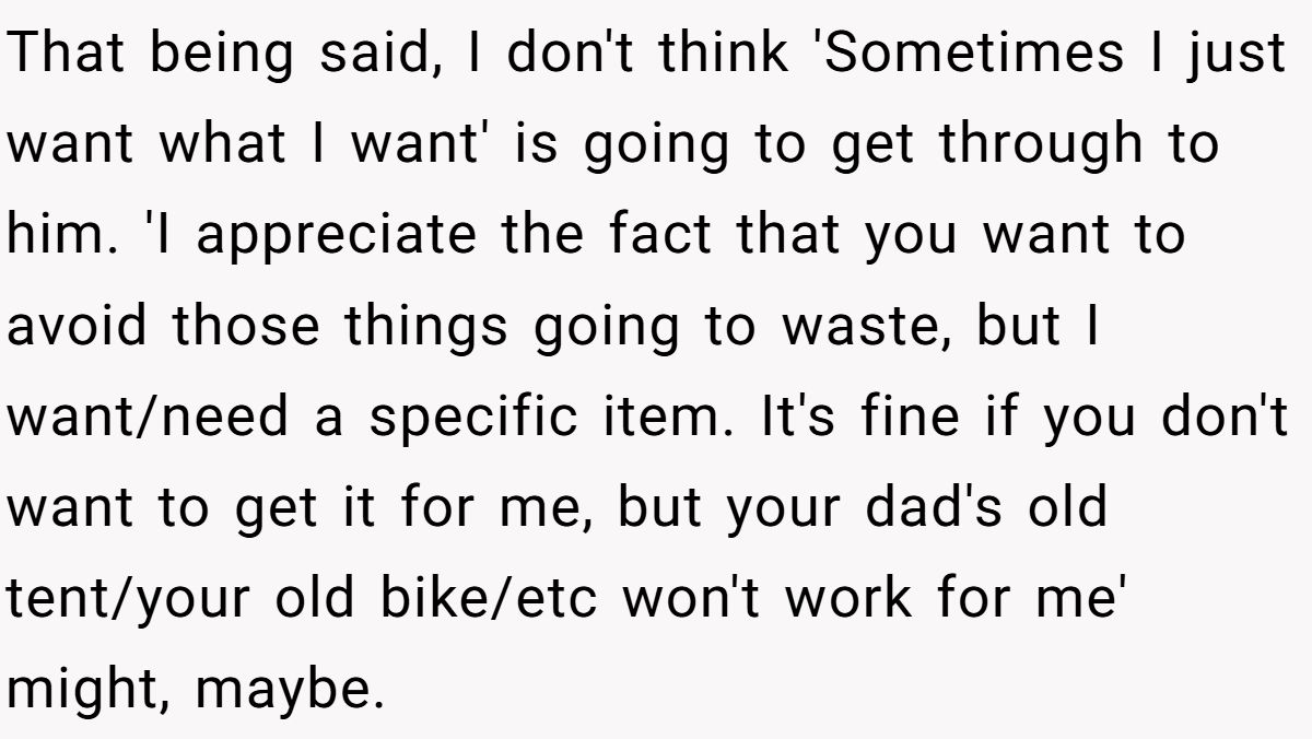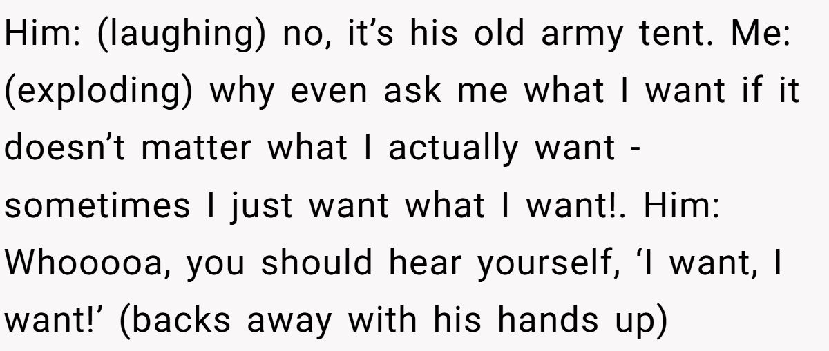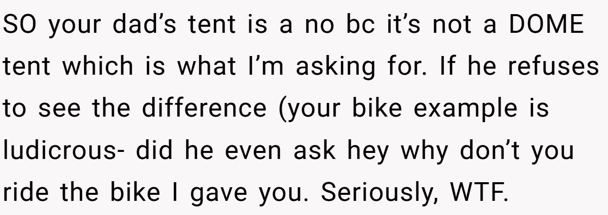This Redditor’s frustration with her partner’s insistence on giving hand-me-downs—like his too-big bike or his dad’s old army tent—instead of her requested items, like a dome tent, boiled over into a fight where he mocked her for wanting “what I want.” Her self-purchase of the tent shows empowerment, but was she wrong to feel upset, or is his gifting a sign of deeper disregard?