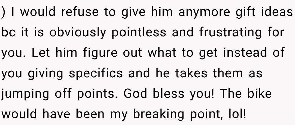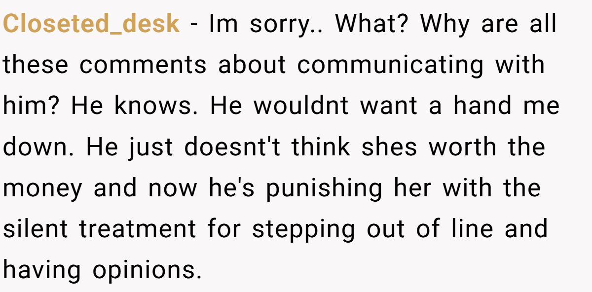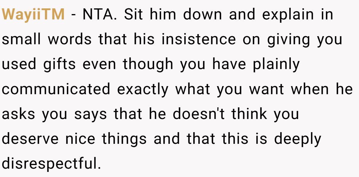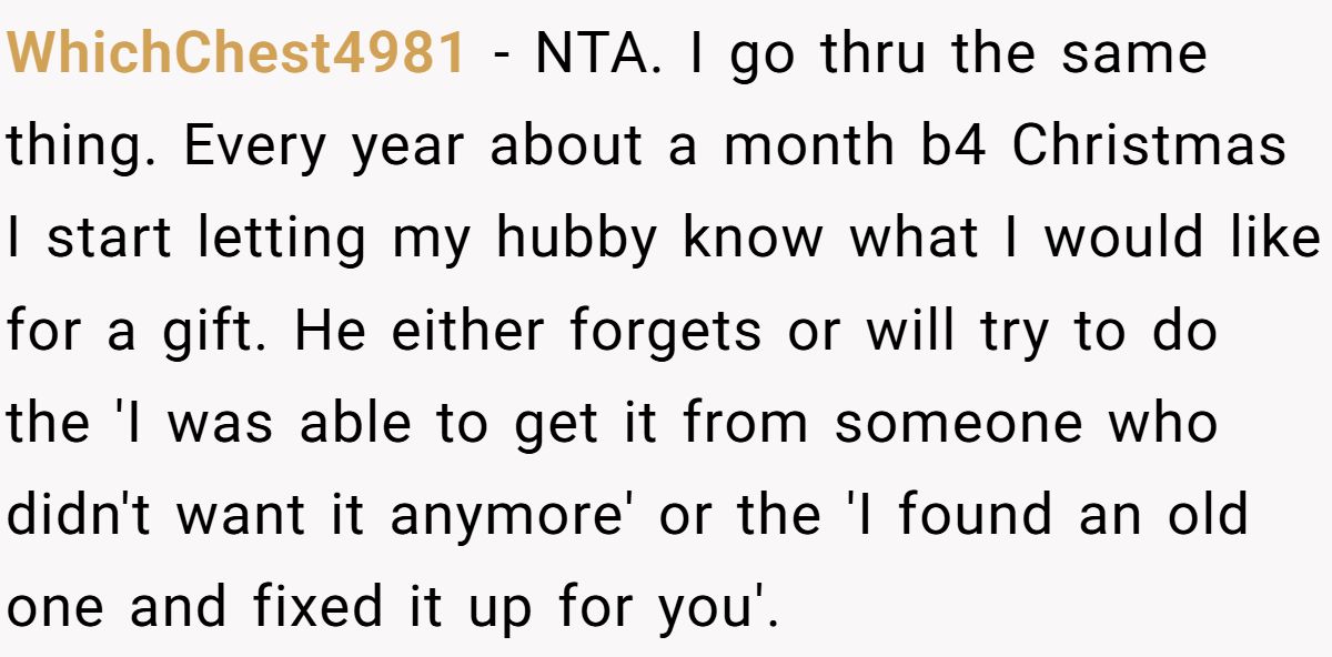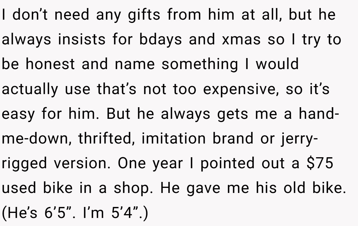 Gift-giving reflects respect. Dr. Gary Chapman, author of The 5 Love Languages, wrote in a 2023 article, “Gifts that ignore a partner’s expressed desires can signal a lack of emotional investment”. The Redditor’s clear requests, backed by links, were dismissed for thrifted or repurposed items, ignoring her practical needs (e.g., a bike fit for her 5’4” frame). His mockery and silent treatment via gaming escalate the issue into disrespect.