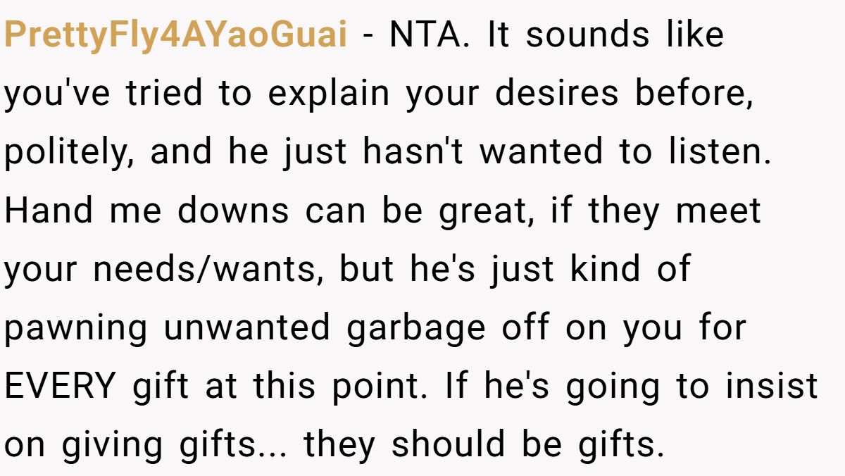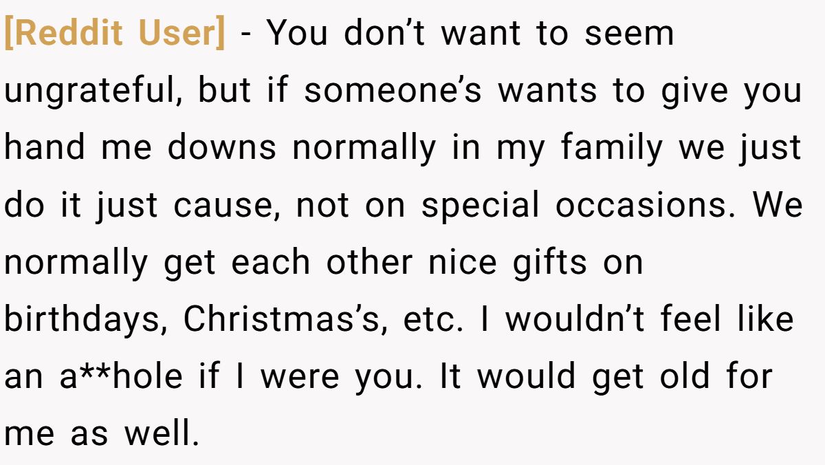 Reddit’s gift-givers backed the Redditor, calling her partner’s hand-me-downs lazy and disrespectful