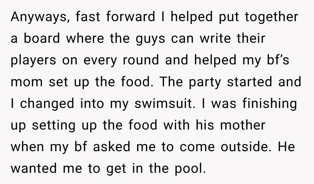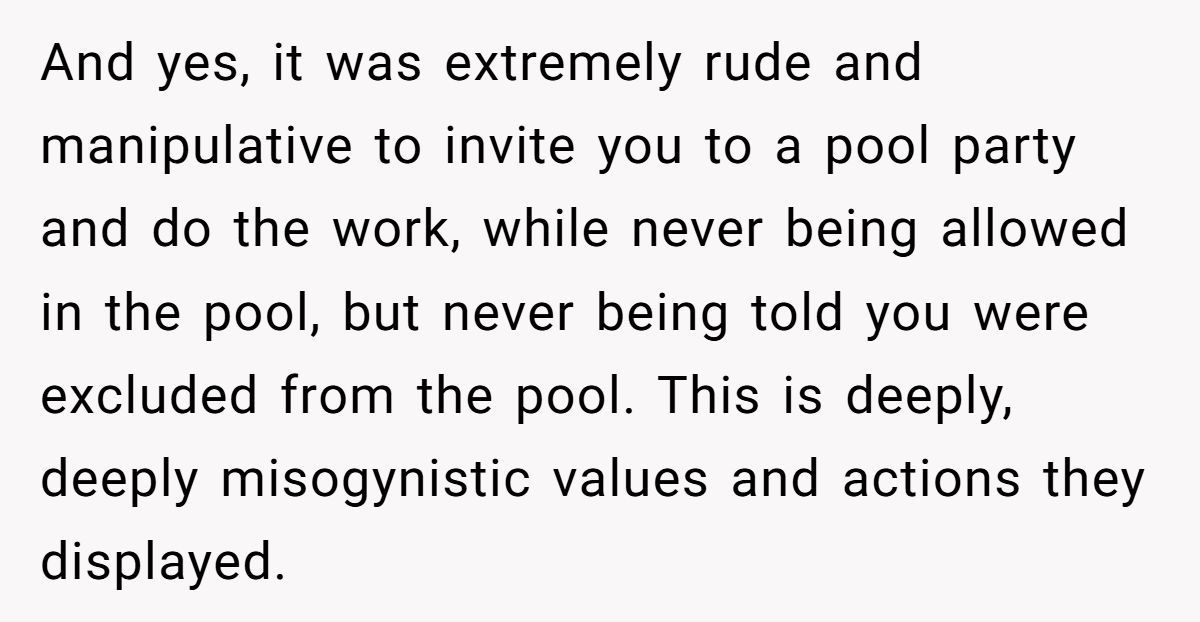 Users criticized the in-laws for inviting her to a pool party without disclosing the rule, noting her kitchen duties while men enjoyed the pool