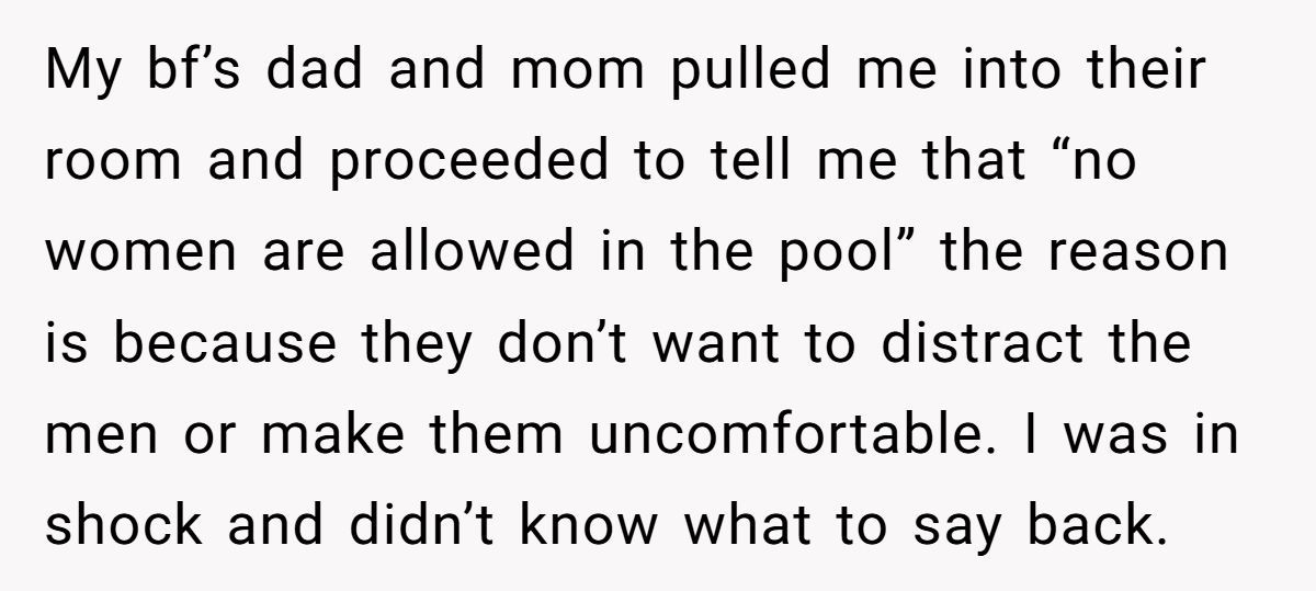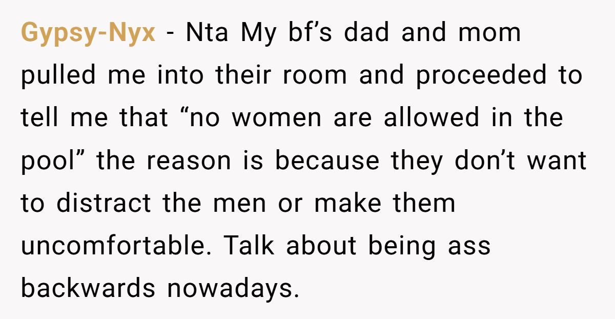 Ever been invited to a pool party only to be told you’re not allowed in the water? That’s the jaw-dropping slight one Redditor endured at her boyfriend’s parents’ Florida home, where a “no women in the pool” rule—meant to avoid “distracting” men—left her humiliated.