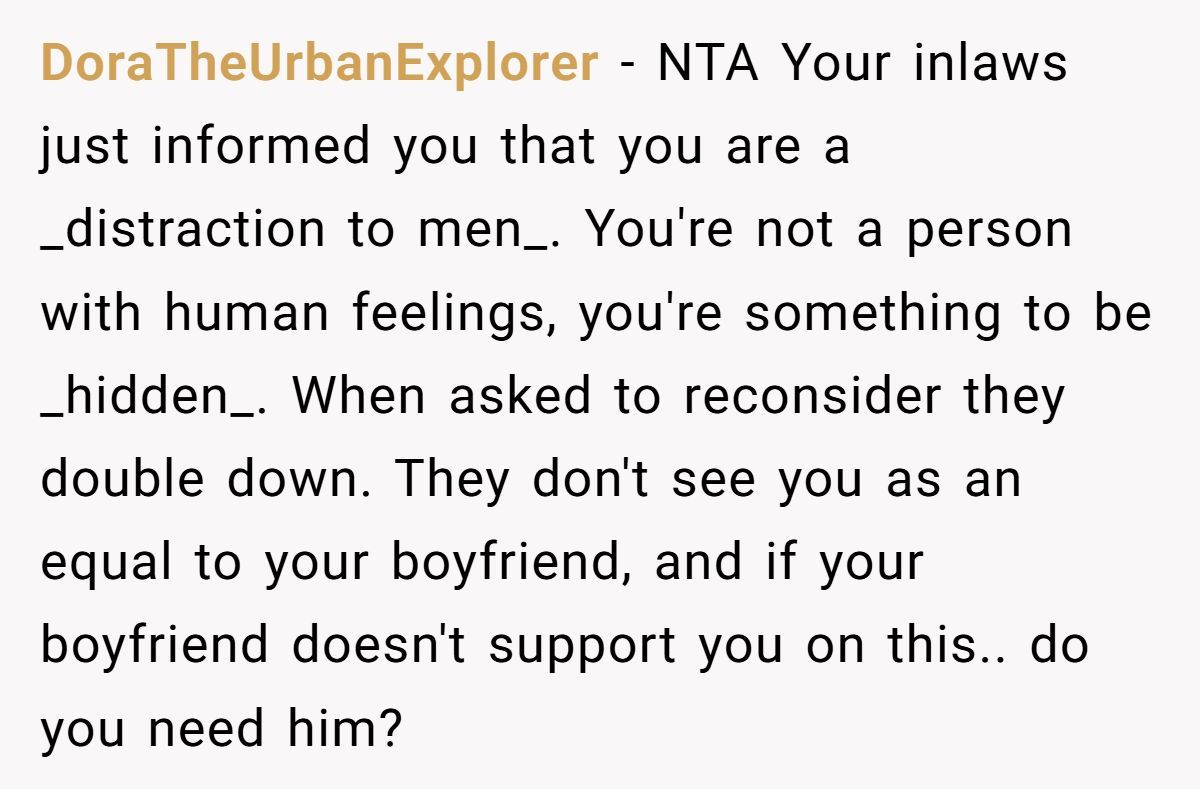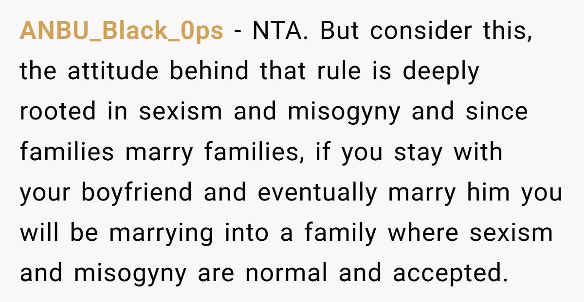 Was she right to draw a line, or is she overreacting to their “old school” ways? Should she push her boyfriend to confront his parents or walk away from their home for good? How would you handle a family’s outdated rules? Share your hot takes below!