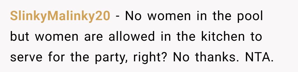 Commenters called the “no women” pool rule patriarchal nonsense, accusing the in-laws of treating the Redditor as a distraction rather than an equal