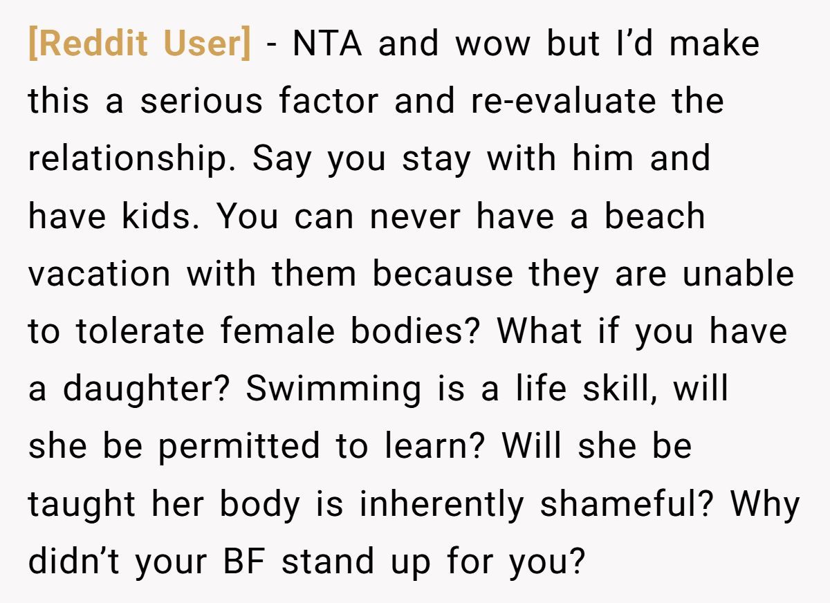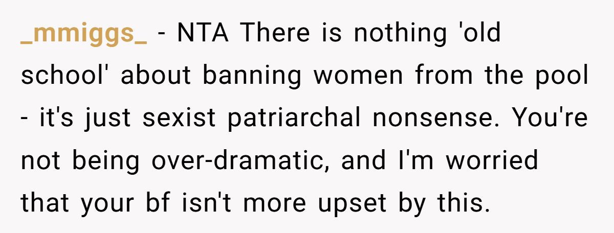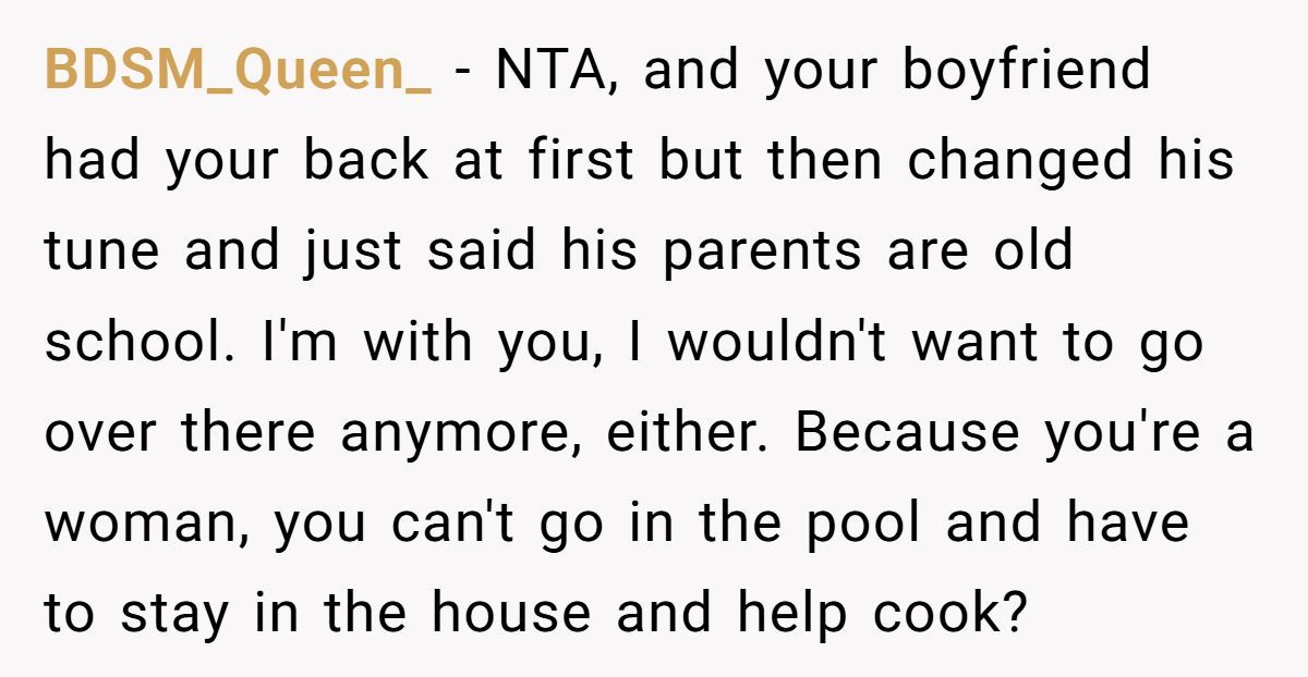 This Redditor’s humiliation at her in-laws’ sexist pool ban pushed her to swear off future visits, but her boyfriend’s dismissal left her questioning her stance.