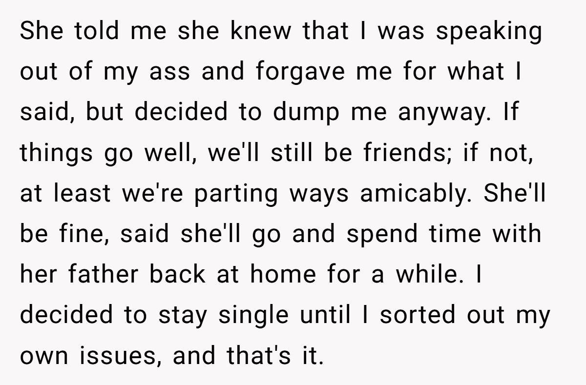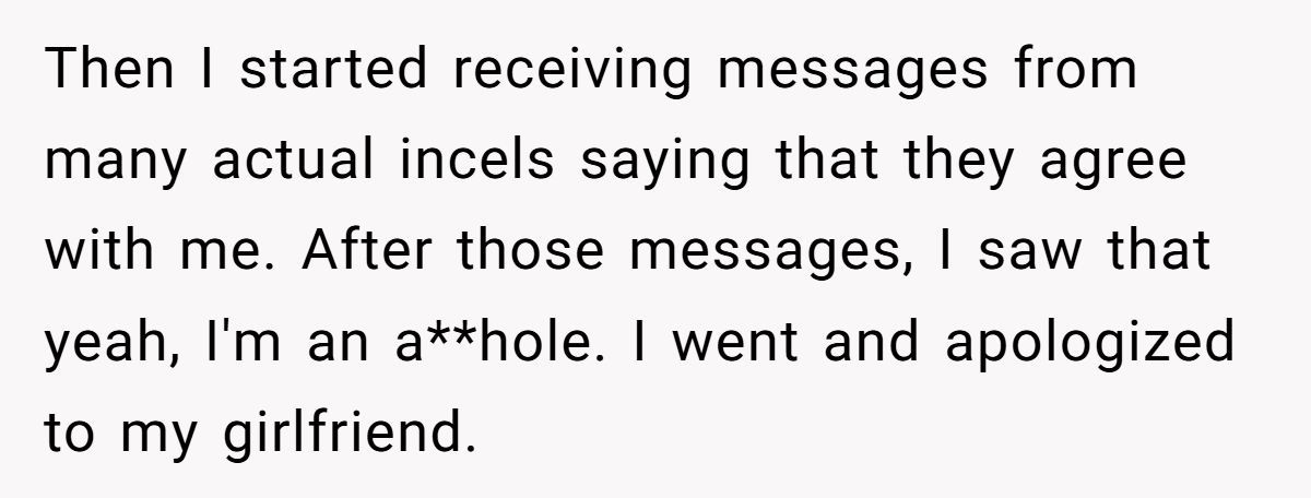 By the end of the post, the OP admits it. After reading Reddit’s reactions—and getting support from actual incels, which was a wake-up call—he apologized. Full-stop. Called himself out. And his girlfriend forgave him… but still dumped him. A tough but fair ending. Because love without empathy isn’t sustainable.