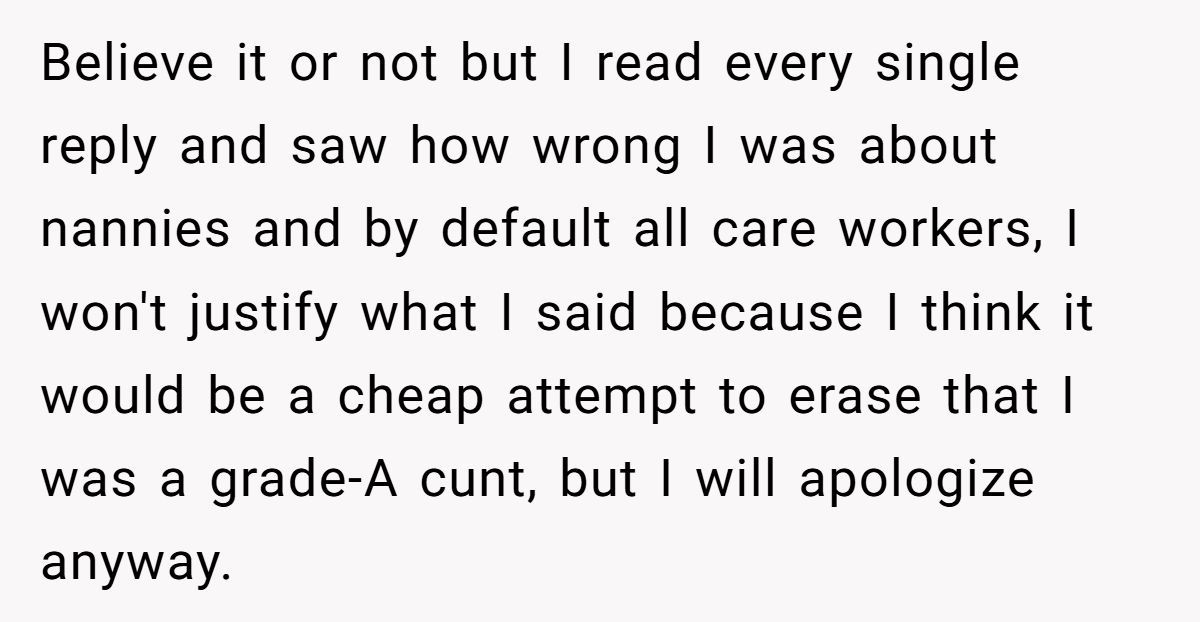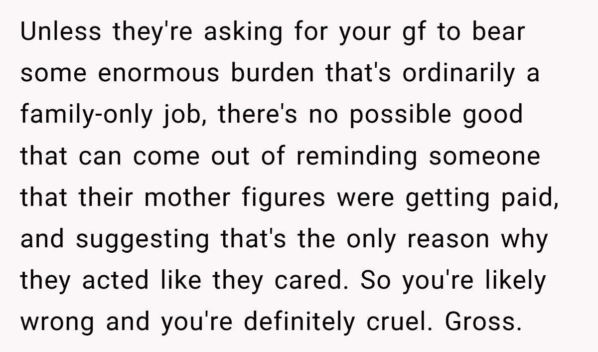 This Redditor’s cruel joke that his girlfriend’s nannies only loved her for a paycheck, after she shared her Mother’s Day traditions, led to a deserved breakup and his belated apology. Reddit roasted his classist insensitivity but noted his growth in recognizing his error.